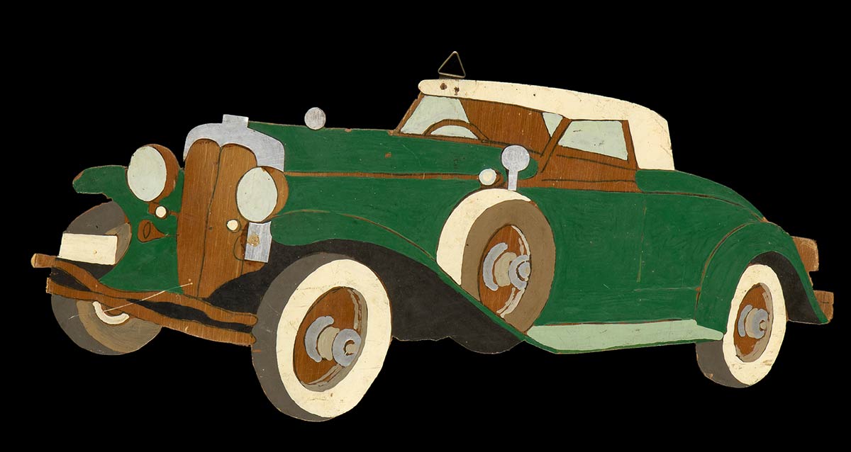 Bel sagomato in legno dolce, di una auto decapottabile, anni '30, VOGUE CAR. Dipinta a mano. Da appendere. Misure cm.39x18. Condizioni medie
