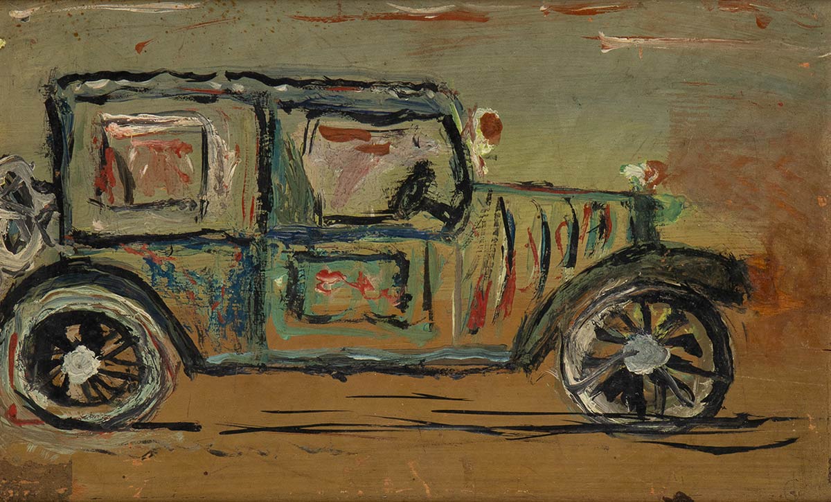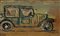 Auto vintage limousine PERLER, acquarello su tavoletta di legno, originale. Anni '40. Misure cm.34x21, condizioni buone