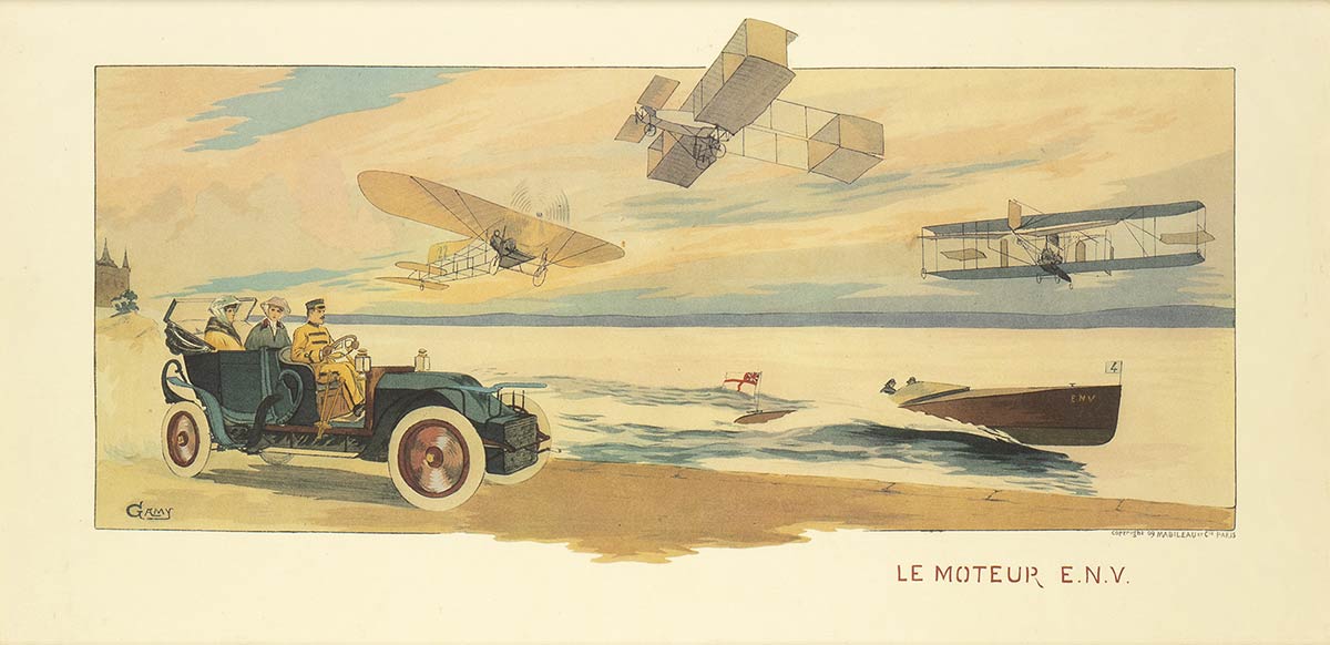 Litografia LE MOTEUR E.N.V. , disegno di Marguerite GAMY, su soggetto Copyright 1909 Mabileau et C.ie Paris. Misure cm.64x34, condizioni A-