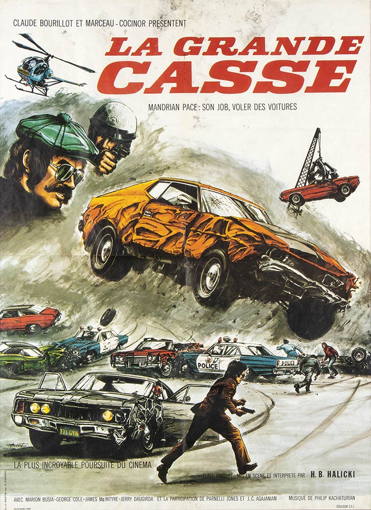 Manifesto per film LA GRANDE CASSE prodotto da Claude Bourillot e Marceau Cocinor. Regia H.B.Halicki, del 1974. Misure cm.50x70 condizioni B