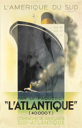 Ristampa del 1983 del manifesto disegnato da Cassandre nel 1931, per la tratta oceanica verso L'AMERIQUE DU SUD effettuata dal PAQUEBOT L'ATLANTIQUE. Misure cm.68x104, condizioni B
