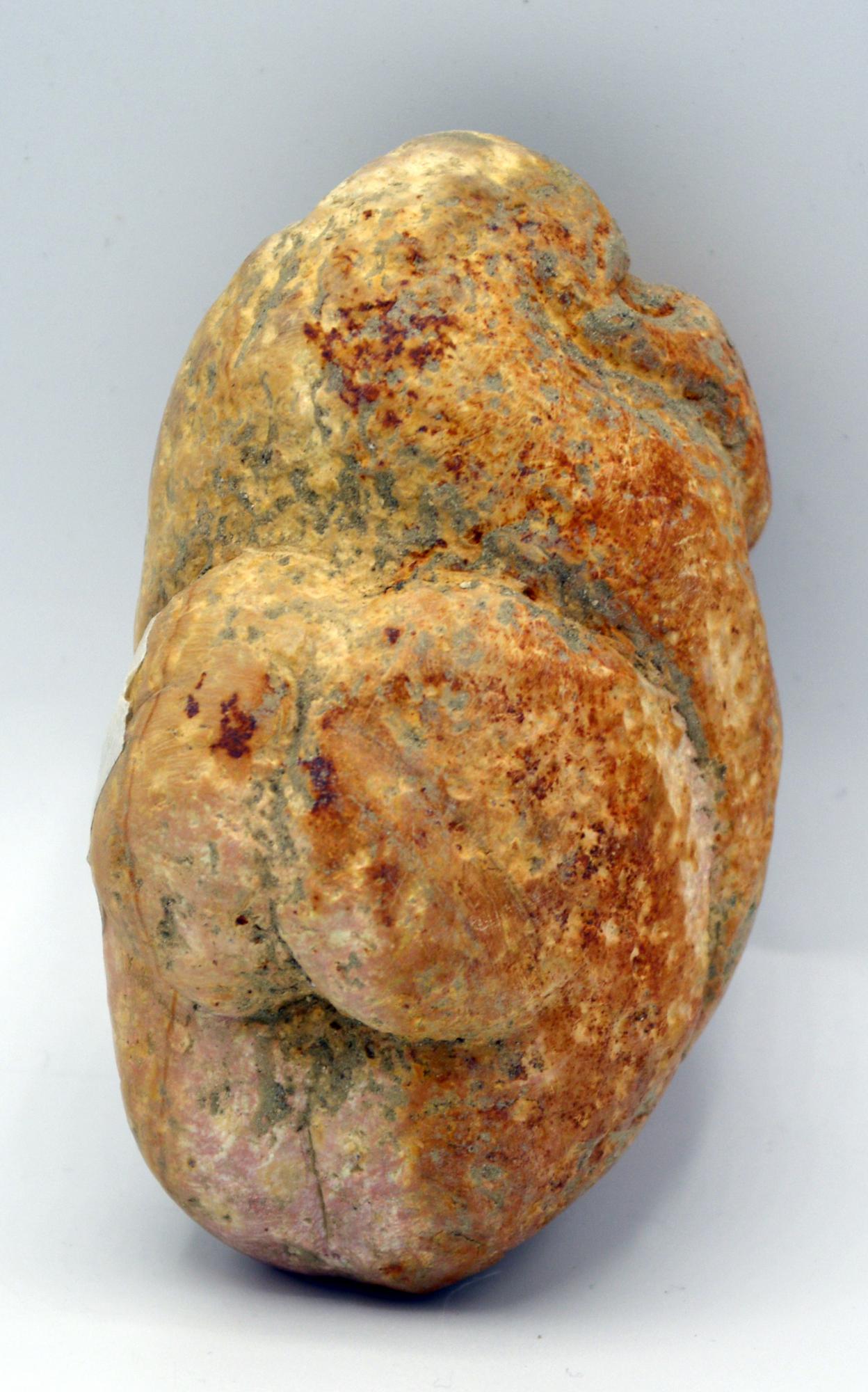 Statuetta di dea madre steatopigia raffigurata stante, con testa sferica senza indicazione del volto, con grandi seni, ampio ventre prominente, gambe corte e tozze, sesso e natiche in evidenza.