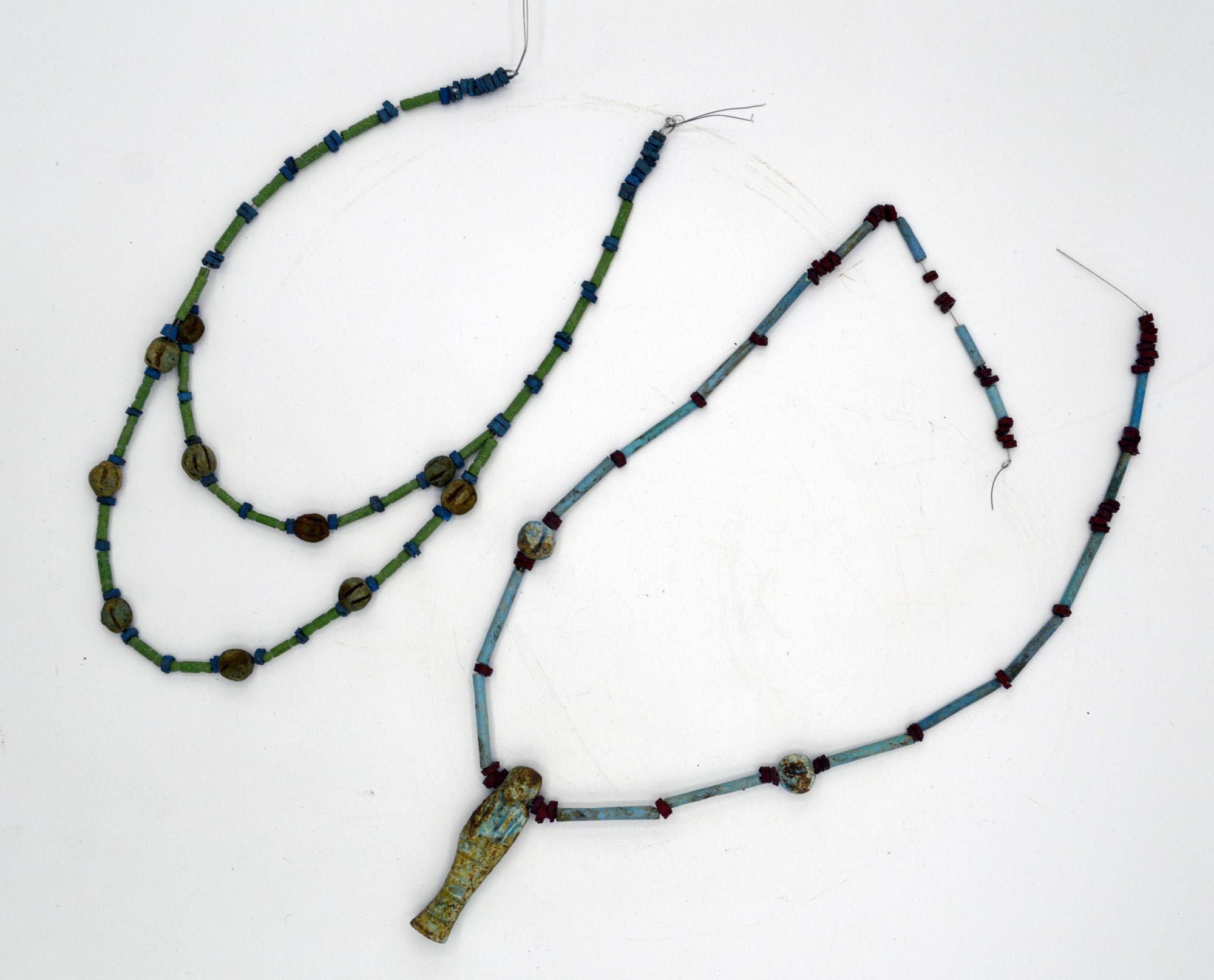 Due collane ricomposte con materiali antichi, una a doppio filo con tubuli in vetro verde alternati a vaghi in faience a forma di melograna stilizzata, l'altra con tubuli in faience azzurra alternati a melograne in faience, al centro un vago un piccolo ushabti. (2)