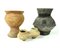 Un vaso su ampio piede a tromba con corpo ovoide e orlo svasato; olla con alto orlo estroflesso, collo cilindrico, risega alla base del collo, corpo bitroncoconico, piede cilindrico; vaso gemino costituito da due ollette globulari riunite da un elemento cilindrico