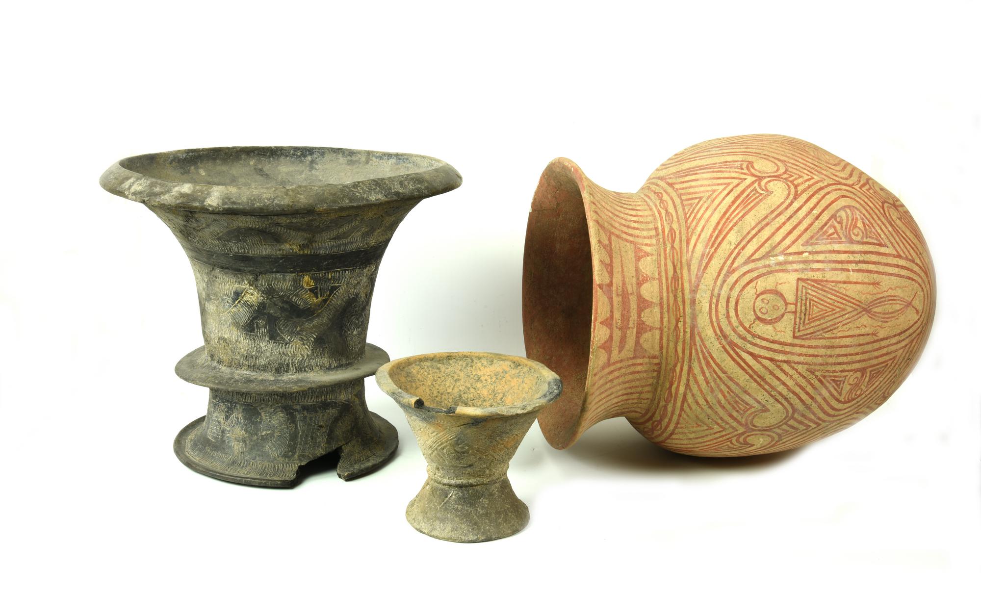 Un vaso su ampio piede a tromba con anello plastico in rilievo e corpo svasato; grande olla con alto orlo estroflesso, collo cilindrico, corpo ovoide, fondo convesso; vasetto a calice con corpo svasato e piede tronconico