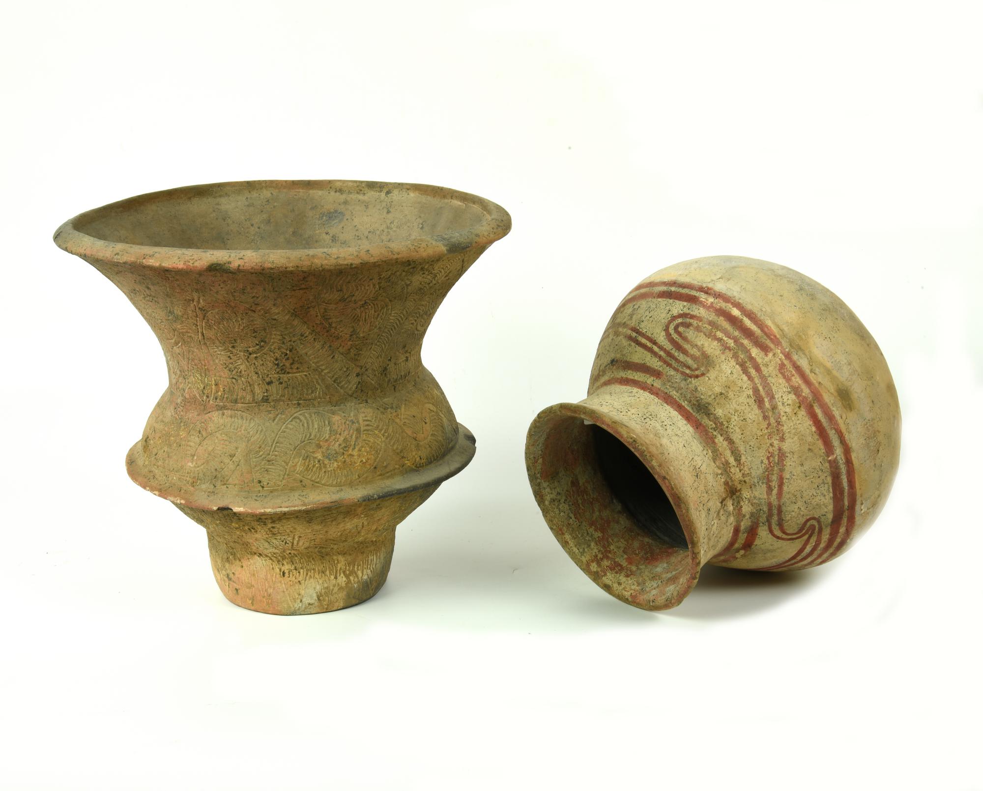 Un vaso su piede cilindrico con anello plastico in rilievo e corpo svasato; olla con orlo estroflesso, collo cilindrico, corpo ovoide, fondo convesso
