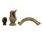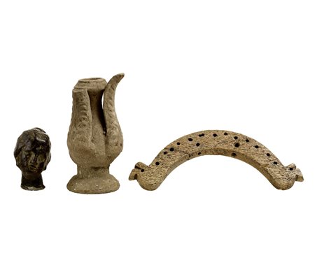 Elemento floreale con bocciolo fra foglie verticali, parte di vaso canosino; testina femminile con acconciatura a melone in bronzo, calco ottocentesco da statuetta ellenistica strumento arcuato in osso desinente a teste di uccello con tredici fori passanti, parte forse di strumento musicale (3)