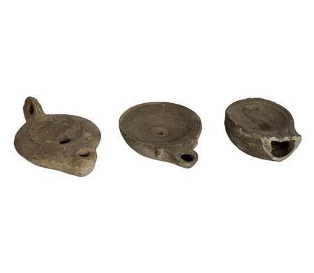 Lucerna a disco con corpo biconico circolare; corto beccuccio arrotondato; presa ad anello; disco separato dalla spalla da tre modanature. Busto di felino in corso a sinistra. Sul fondo a disco marchio di fabbrica CIV..; due lucerne a volute con basso serbatoio troncoconico; spalla piana decorata da modanature concentriche; disco ribassato con foro di alimentazione centrale decorato a fasce concentriche, una con fascia con decoro di tratti a raggiera; fascia con ramo di quercia con ghiande); l'altra decorata da figura maschile nuda a destra che tiene una lepre per i piedi, fondo piano (3)