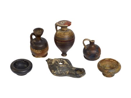 Due piccole lekithoi con bocchello troncoconico rovescio, collo cilindrico, corpo globulare, piede ad anello, ansa a nastro impostata verticalmente dall'orlo alla spalla; una decorata con fascia a trattini obliqui sul ventre, (una delle due priva del bocchello), un unguentario a bottiglia con bocchello appiattito, corpo piriforme e piede a disco, decorato a fasce; una lucerna monolicne con serbatoio globulare ed ansa a nastro lacunosa; due coppette con orlo rientrante, bassa vasca cilindrica, piede troncoconico, integre. (7)