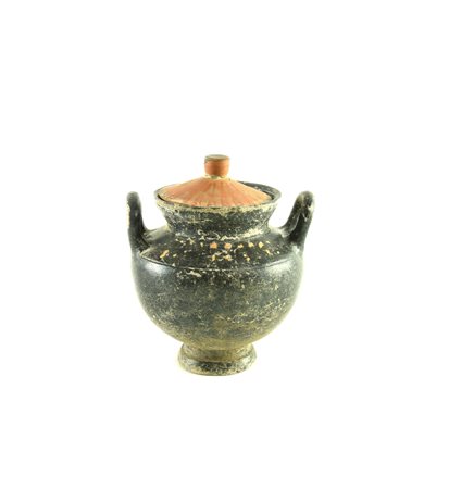 Stamnos con orlo a colletto svasato, spalla obliqua, corpo emisferico, piede ad echino; decorato sulla spalla a falsa baccellatura in giallo provvisto di coperchio a tesa obliqua e presa cilindrica decorato a tratti radiali in rosso