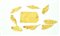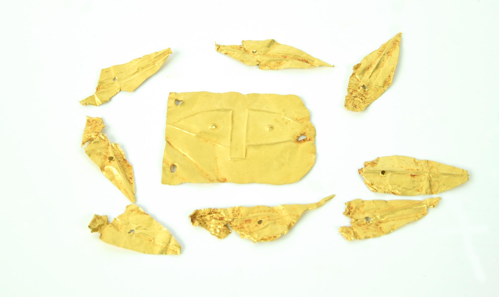Otto foglie lanceolate con costolatura centrale ed un foro per la sospensione, parti di un diadema ed una placchetta rettangolare con inciso un volto umano stilizzato