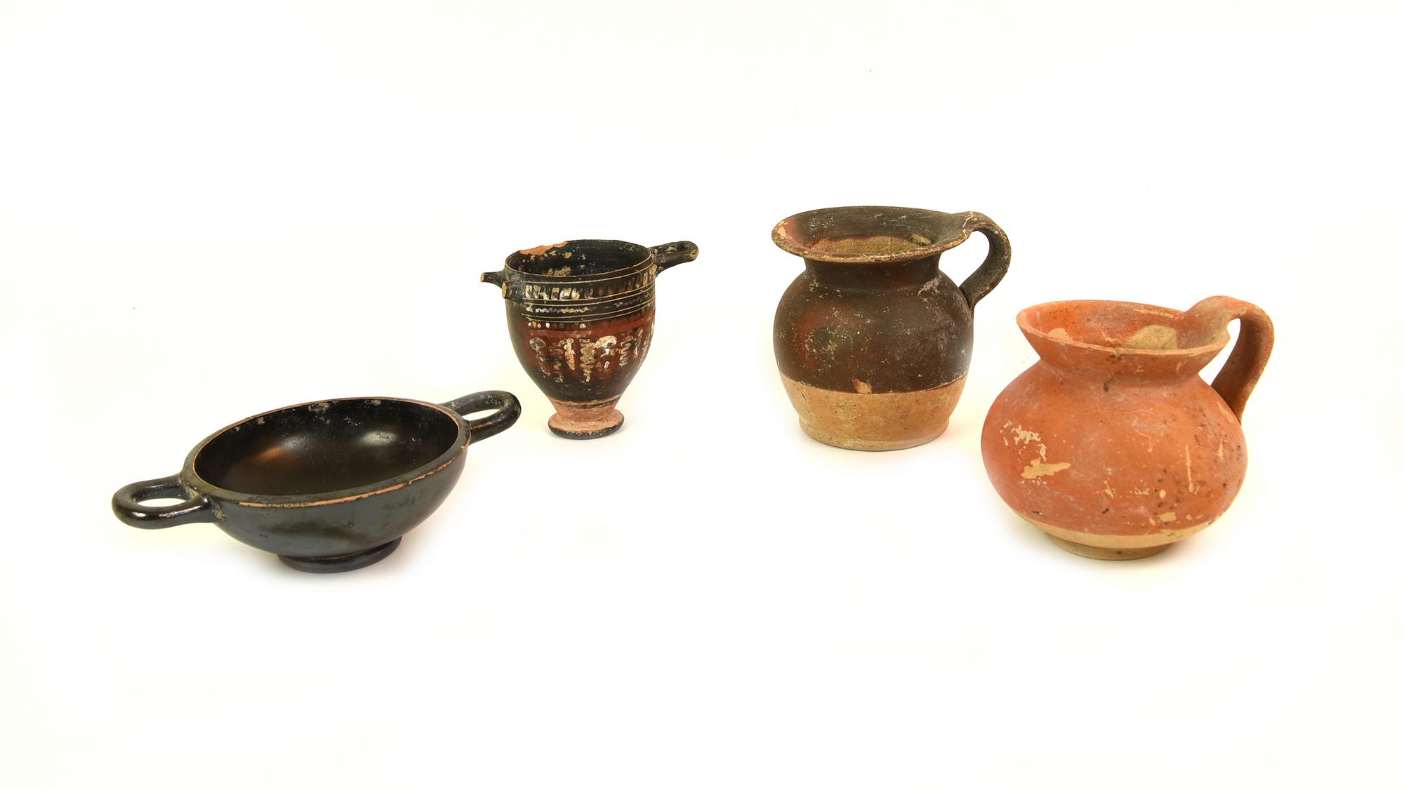 Skyphos con alta vasca troncoconica, piede a disco ed anse a bastoncello orizzontali, decorato a con kyma ionico, motivo a tremolo e fascia di puntini sopra una pergola con grappoli e pampini; piccola kylix a vasca troncoconica, basso piede ad anello, anse a bastoncello impostate orizzontalmente sotto l'orlo; due brocchette daunie a fasce con orlo svasato, corpo ovoide, piede a disco, ansa a nastro, impostata sull'orlo e la spalla (4)