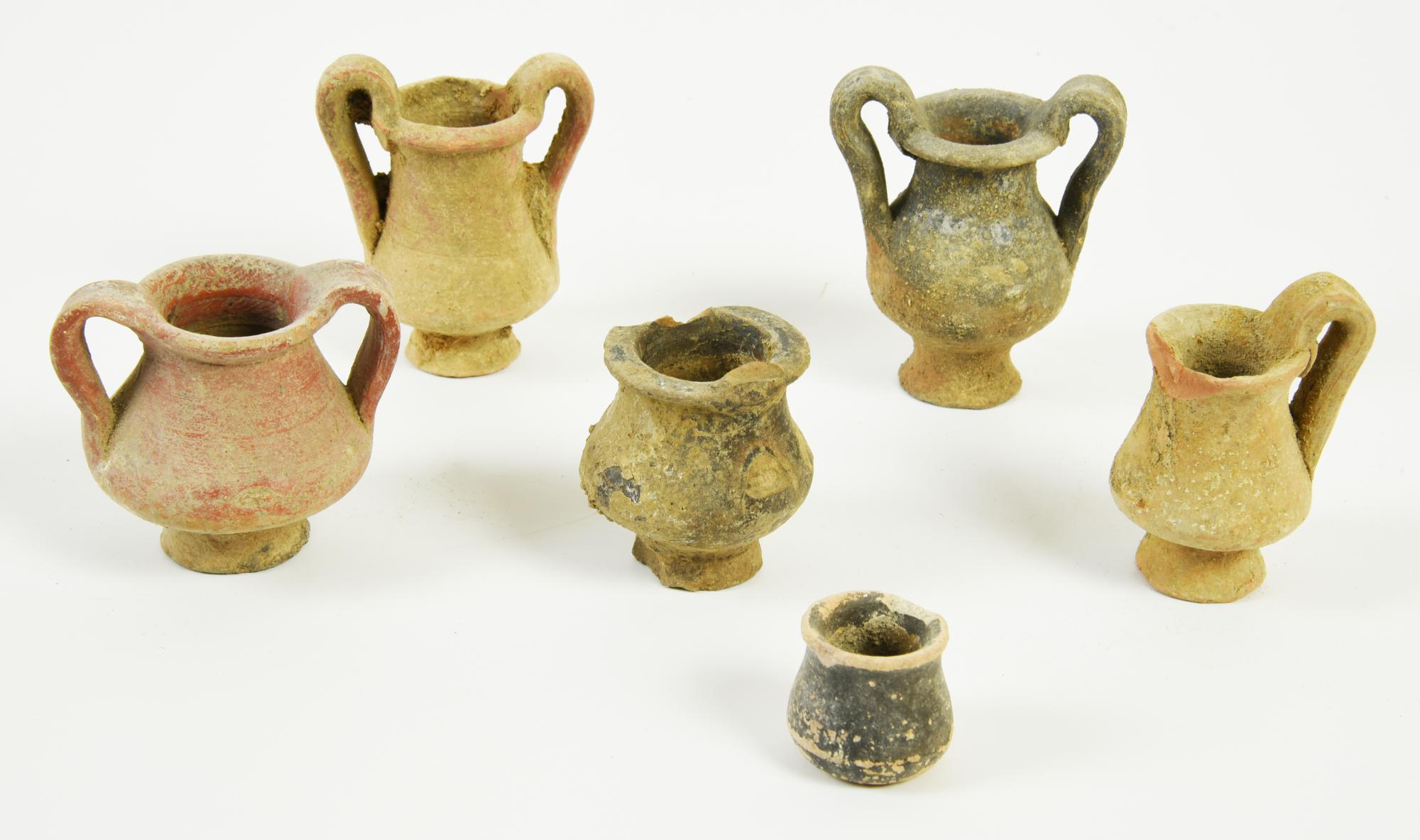 Cinque krateriskoi con orlo estroflesso a tesa, corpo bitroncoconico, anse a nastro impostate verticalmente dall'orlo alla risega, piede troncoconico, un vasetto miniaturistico con orlo estroflesso e corpo ovoide