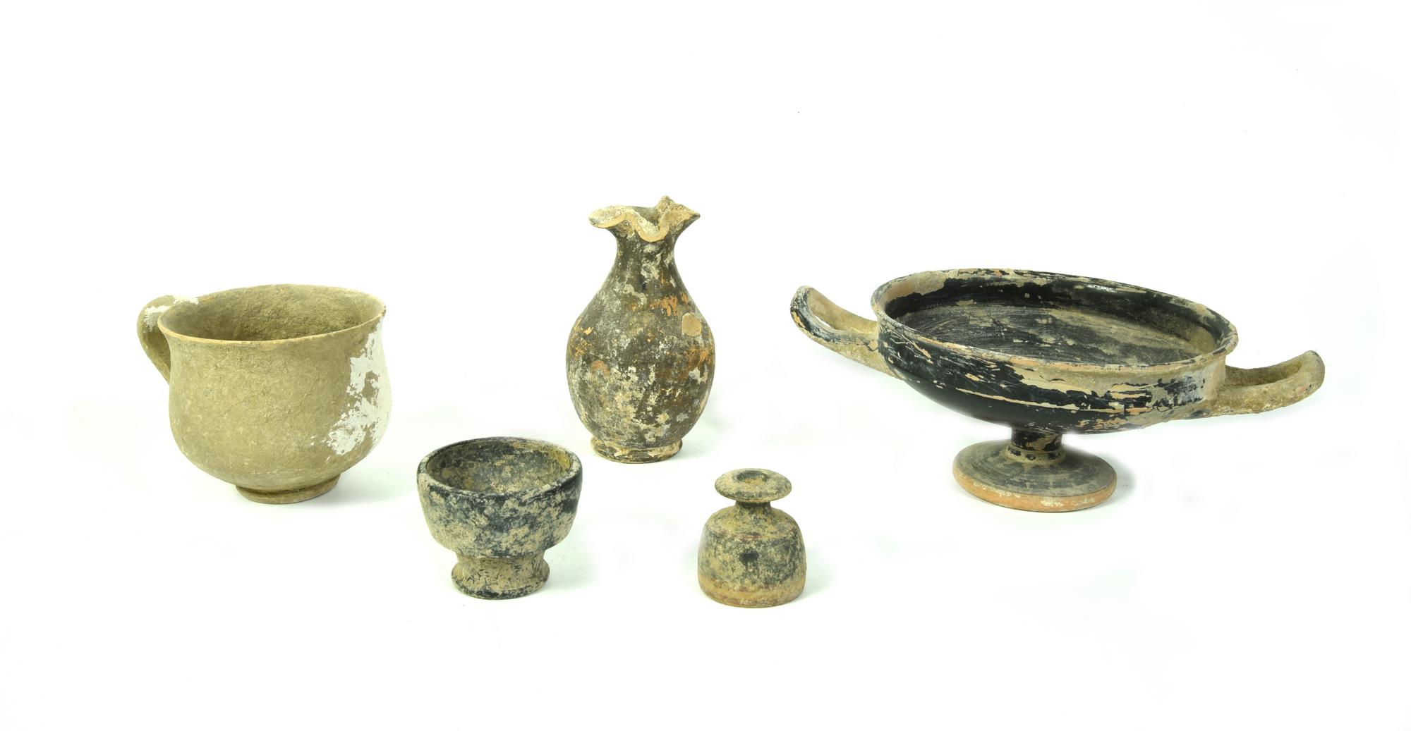 Una kylix su alto piede a tromba con vasca profonda ed anse a bastoncello impostate sulla vasca e ritorte verso l'alto; un'oinochoe a bocca trilobata e corpo ovoide, piede ad anello, una coppetta con vasca troncoconica, una tazza monoansata con labbro leggermente estroflesso; un piccolo unguentario con bocchello a tesa e corpo troncoconico