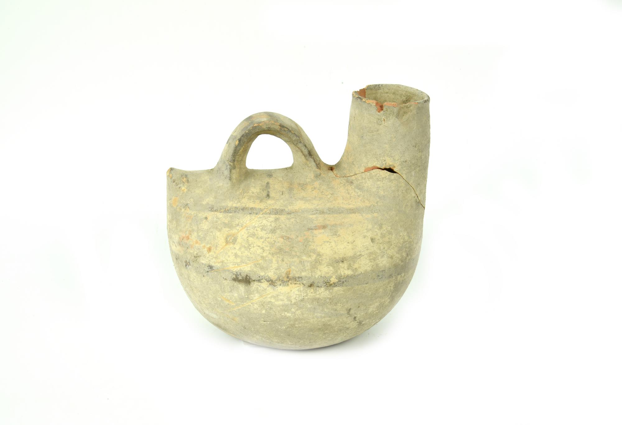 Askos con orlo lievemente svasato indistinto dal collo cilindrico, corpo globoso allungato, con estremit� posteriore appuntita, fondo piatto; ansa a nastro impostata longitudinalmente sul dorso, decorato a fasce orizzontali e motivi diagonali