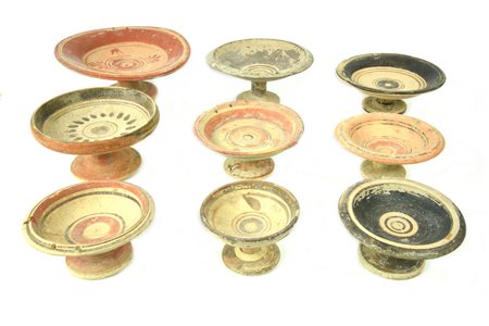 Nove grandi piattelli con orlo svasato, vasca semicilindrica poco profonda, piede a tromba, decorati a fasce e motivi fitomorfi