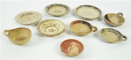 Quattro grandi piattelli con orlo svasato, vasca semicilindrica poco profonda, piede a tromba, decorati a fasce e cinque coppette monoansate con vasca poco profonda, fondo piatto, ansa a nastro impostata orizzontalmente sull'orlo