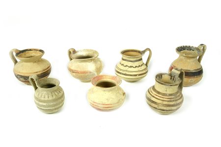 Sette brocchette con labbro svasato distinto dal corpo globulare o lenticolare schiacciato, fondo piatto, ansa a nastro impostata verticalmente dal labbro alla spalla, decorate a fasce parallele e motivi geometrici o a tremolo