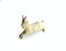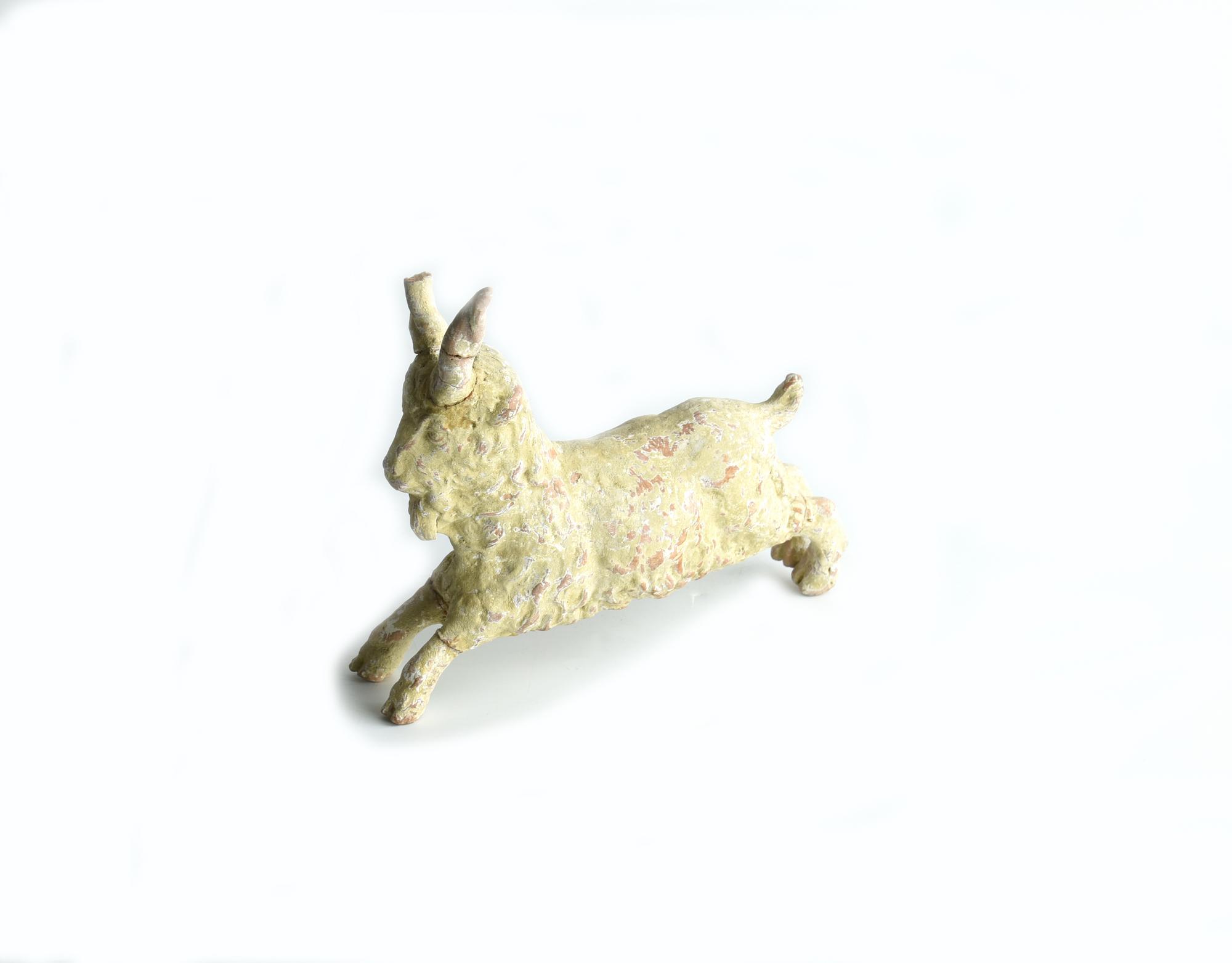 Statuetta che raffigura in modo realistico una capra dal lungo pelame mosso stante accucciata con la testa e la coda erette