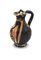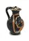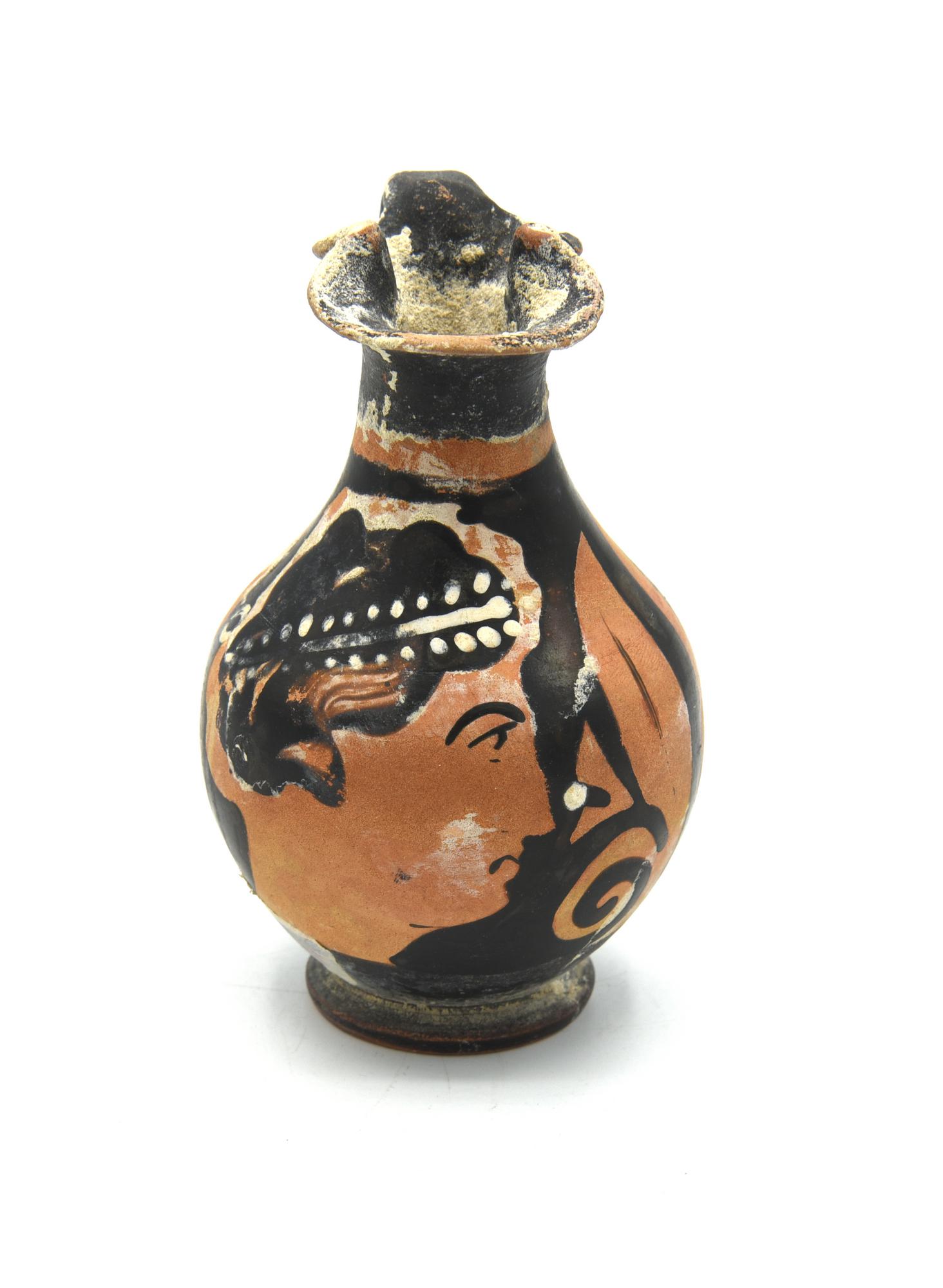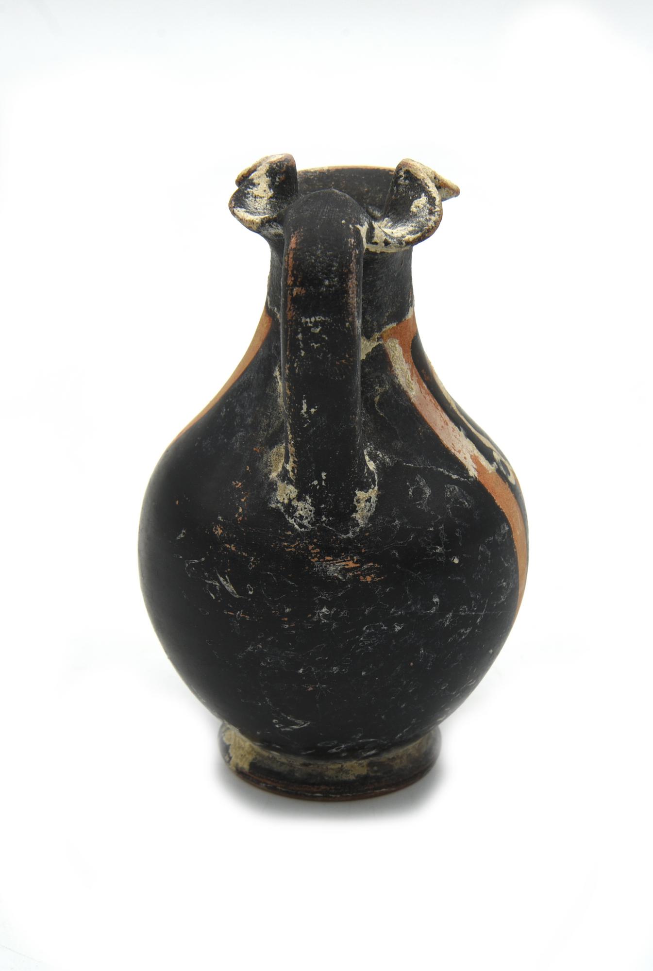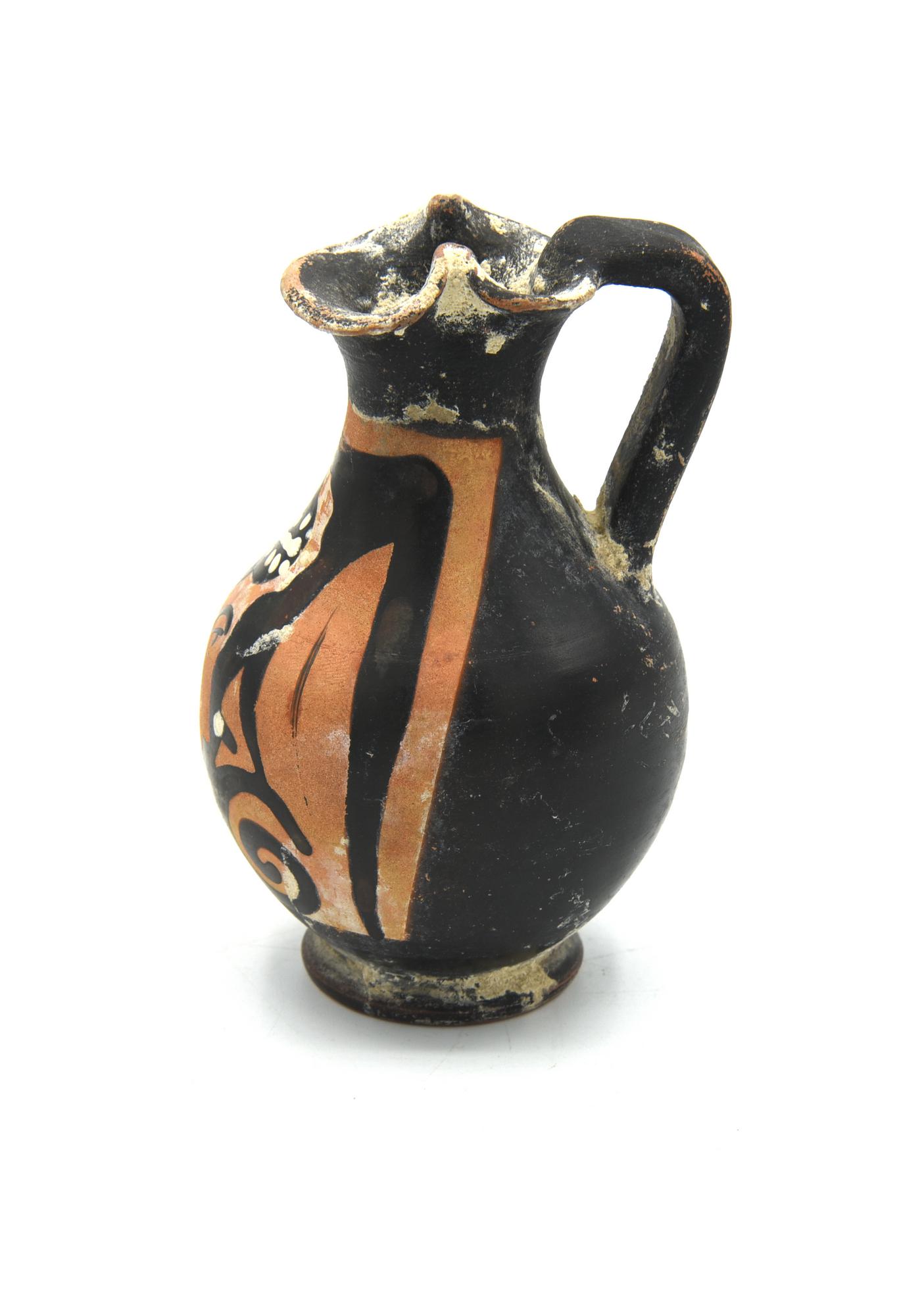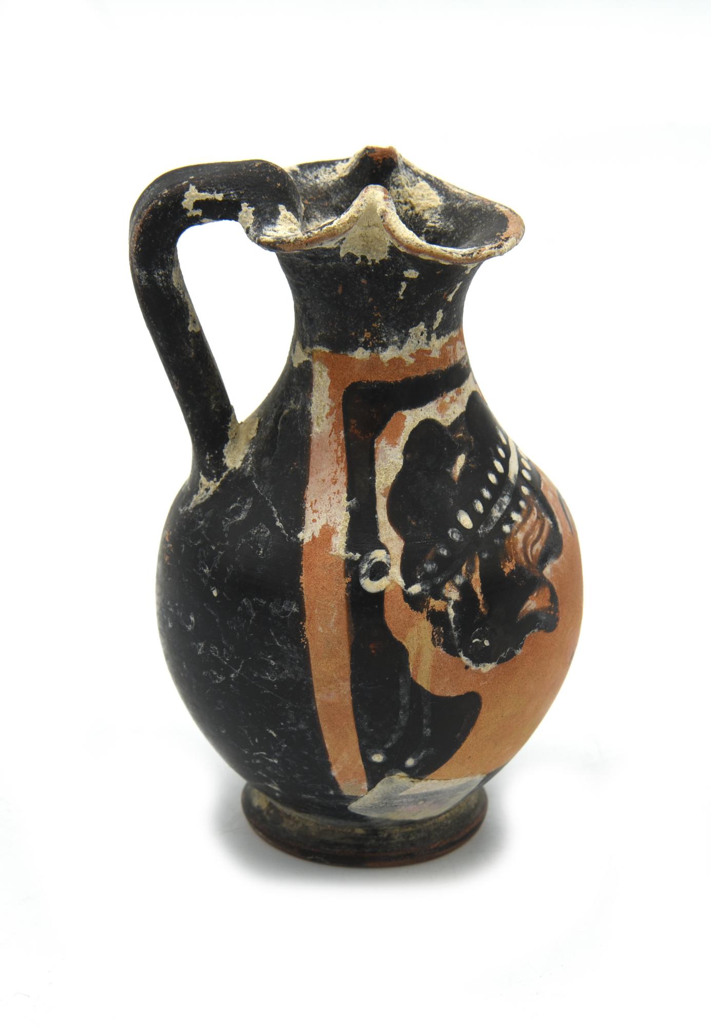Oinochoe a bocca trilobata, corpo piriforme, piede ad anello, ansa a nastro decorata anteriormente con profilo di giovane uomo volto a sinistra, con un tralcio fiorito che gli cinge la fronte, fra due volute vegetali