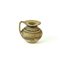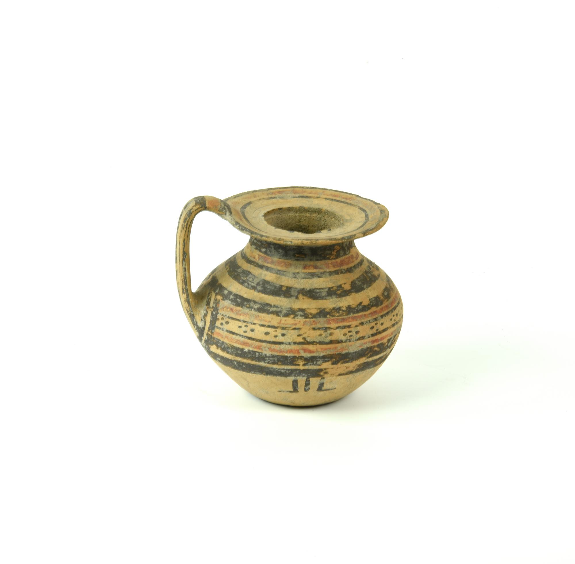Brocca con ampio orlo appiattito, corpo globulare appiattito, ansa a nastro impostata dall'orlo alla spalla, decorata a fasce orizzontali alternate in bruno e paonazzo e da una fascia campita da gruppetti di puntini sulla massima espansione