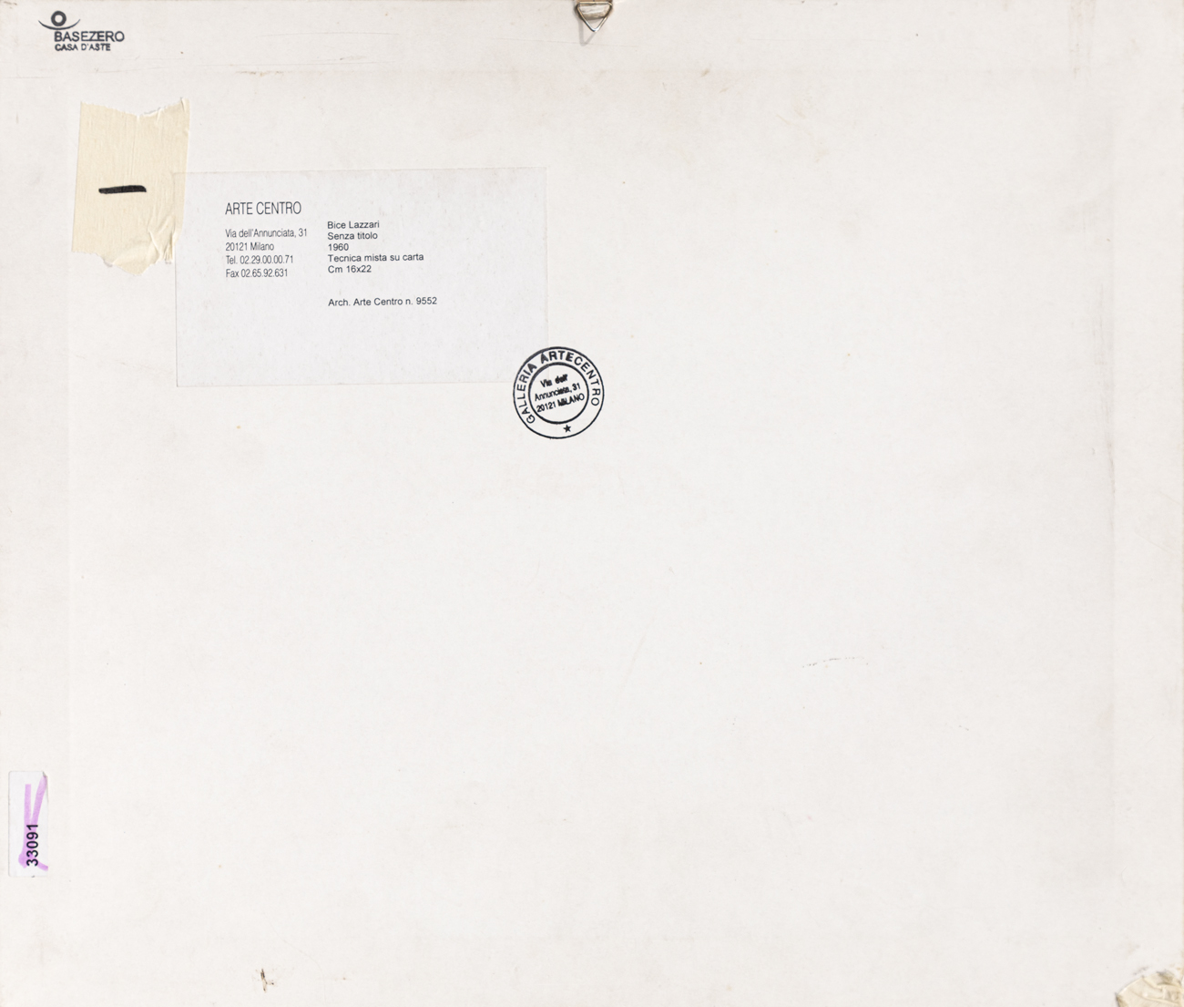 Etichetta e timbro Artecentro (MI) al retro