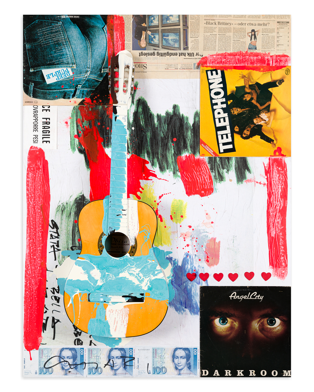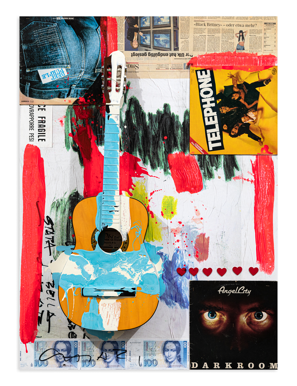 Tecnica mista, collage e applicazione di chitarra su tavola