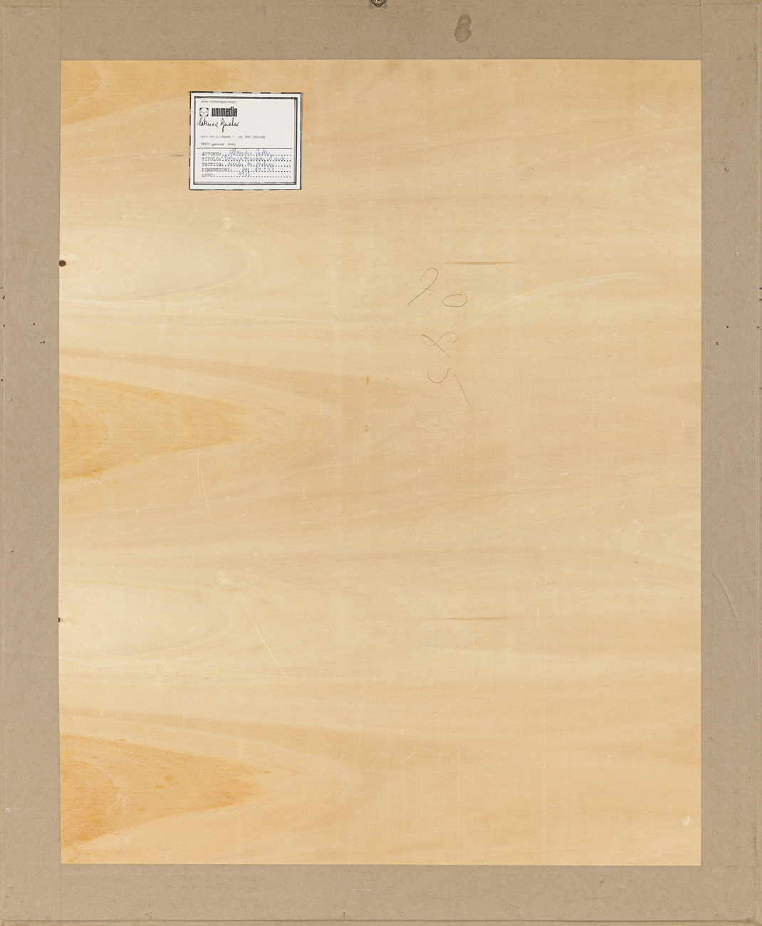 Etichetta della Galleria Unimedia (GE) al retro della tavola protettiva