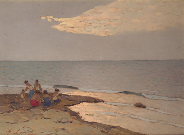 Giovanni Lomi (Livorno, 1889 - 1969) DAGLI SCOGLI VERSO SERA Olio su compensato, cm. 29,5x40 Firma in basso a sinistra.