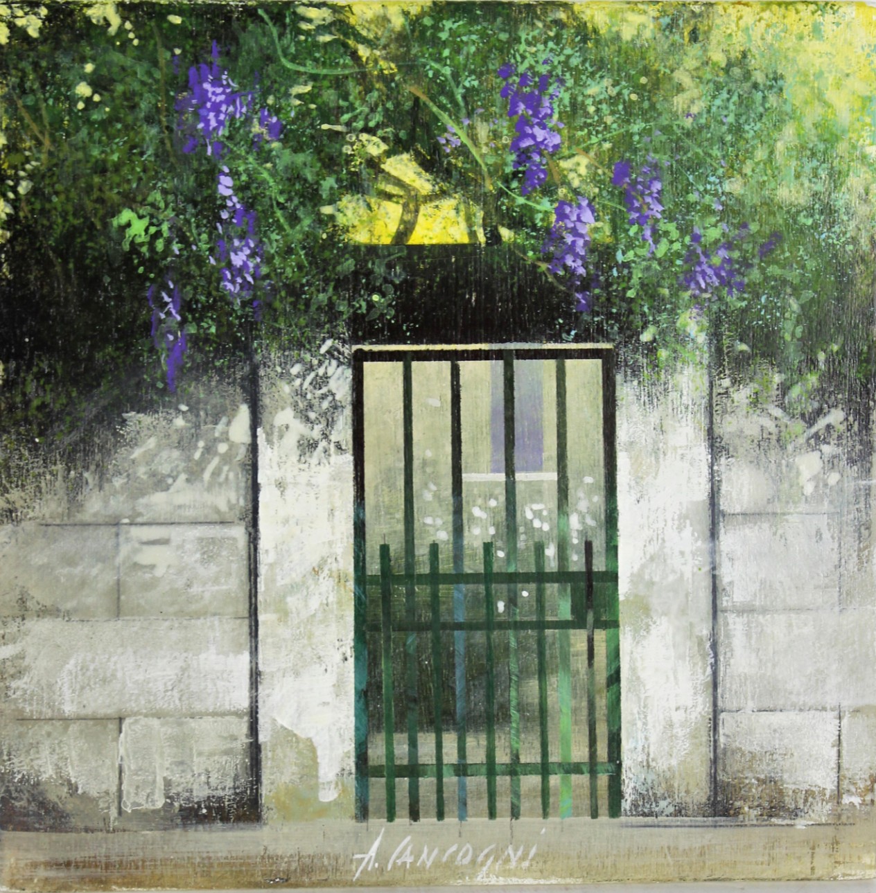 CANCOGNI AGOSTINO Lucca 1950 “Il cancello” olio su tavola cm 20x20 del 2018. Firmato sul fronte in basso al centro. Autentica su fotografia.