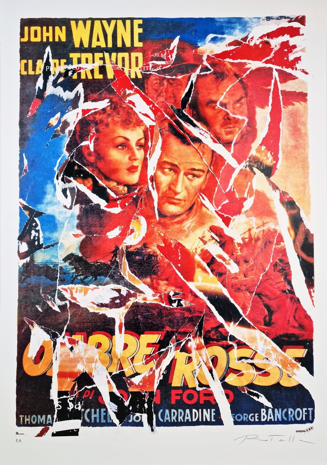 ROTELLA MIMMO Catanzaro 1918-Milano 2006 “Ombre rosse” multiplo decollage e strappi di manifesto su supporto serigrafico su cartoncino cm 70x100 del 2000-2009. Firmato sul fronte in basso a destra, tiratura P.A. Opera pubblicata sul catalogo "Mimmo Rotella multiplo decollage" Silvana Editore a pag. 98 e 99.