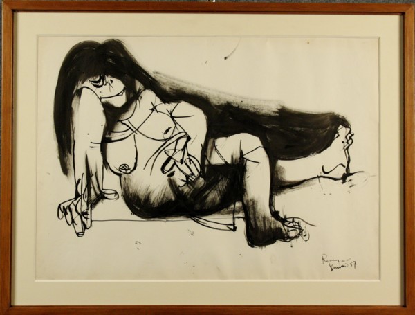 ROMAGNONI BEPI - Nato a Milano nel 1930. Morto a Capo Carbonara (Villasimius-Cagliari) nel 1964. Partecipa alla Biennale di Venezia nel 1956 e nel 1962 e alla Quadriennale di Roma nel 1956. Disegno china su cartoncino raff. ''MODELLA''. Firmato e datato 1957 in basso a destra. In cornice. Mis. Lung. cm. 70 Alt. cm. 50 ca.