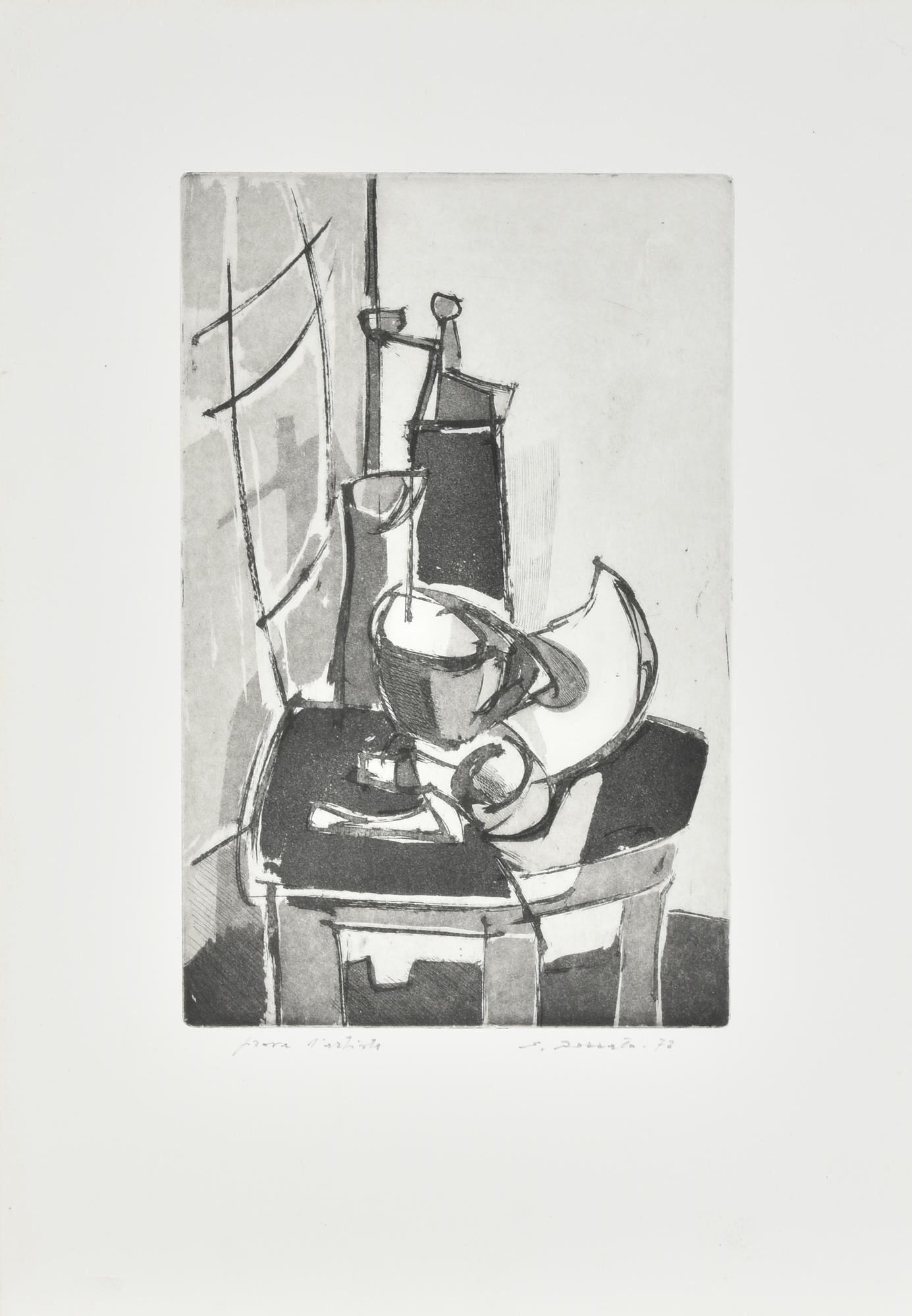 Epifanio Pozzato NATURA MORTA SU SGABELLO incisione su carta, cm 50x35...