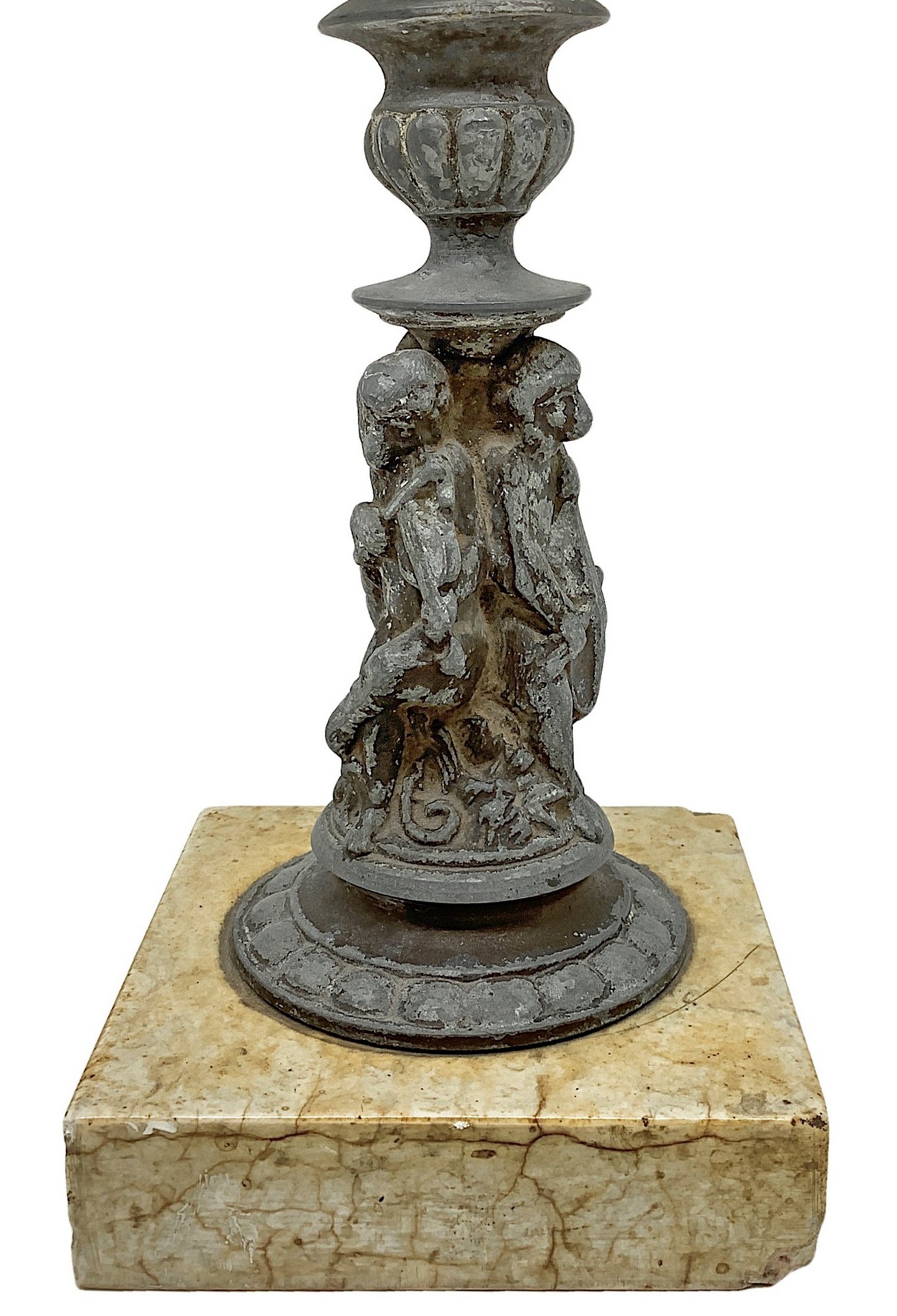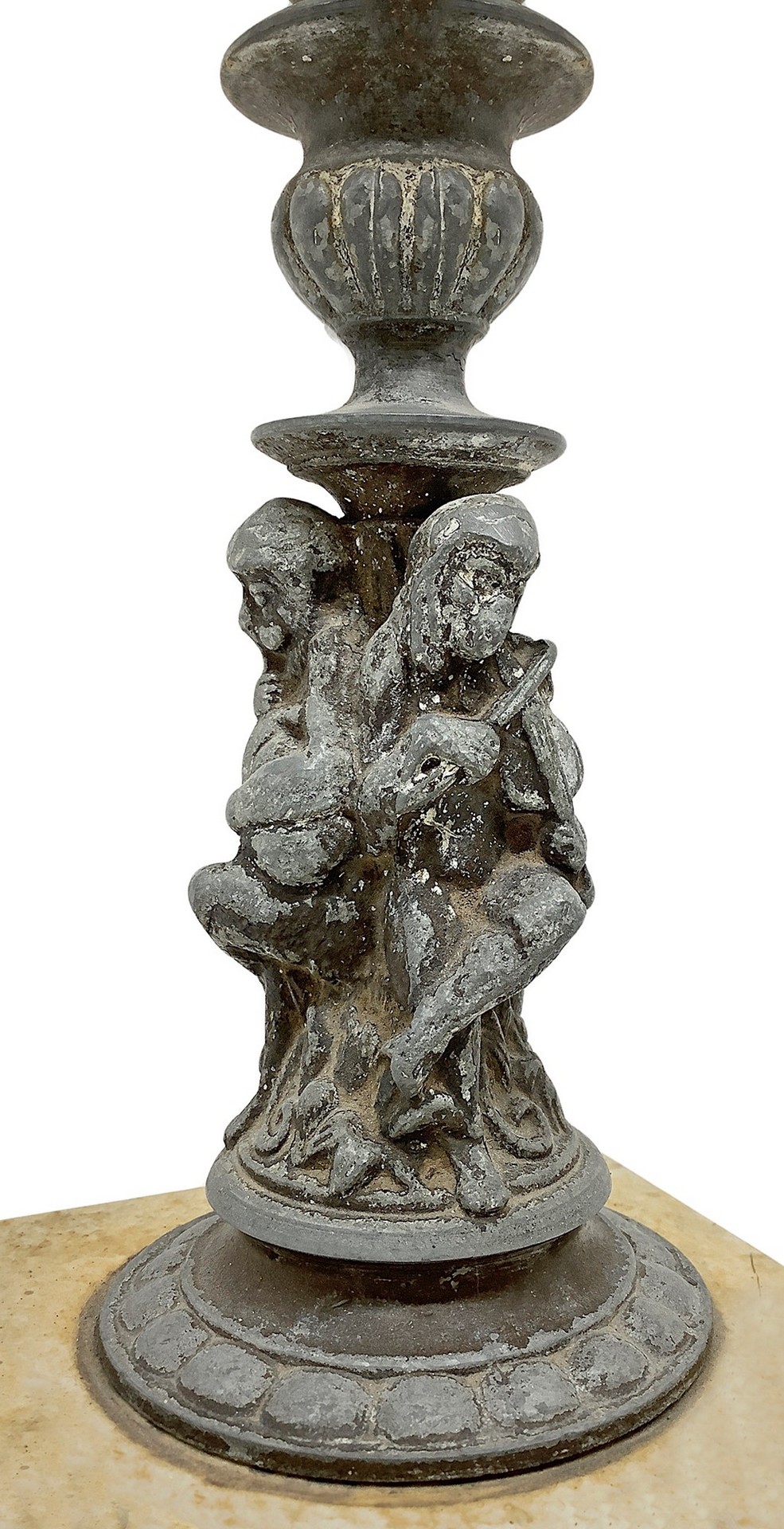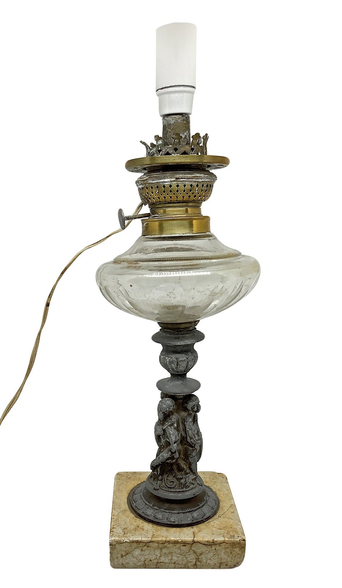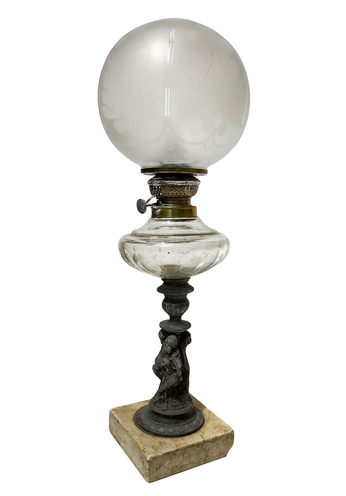 Lume a petrolio h 45 cm, b 10x10 cm Con boccia a palla con disegni in stile Liberty, base in marmo.