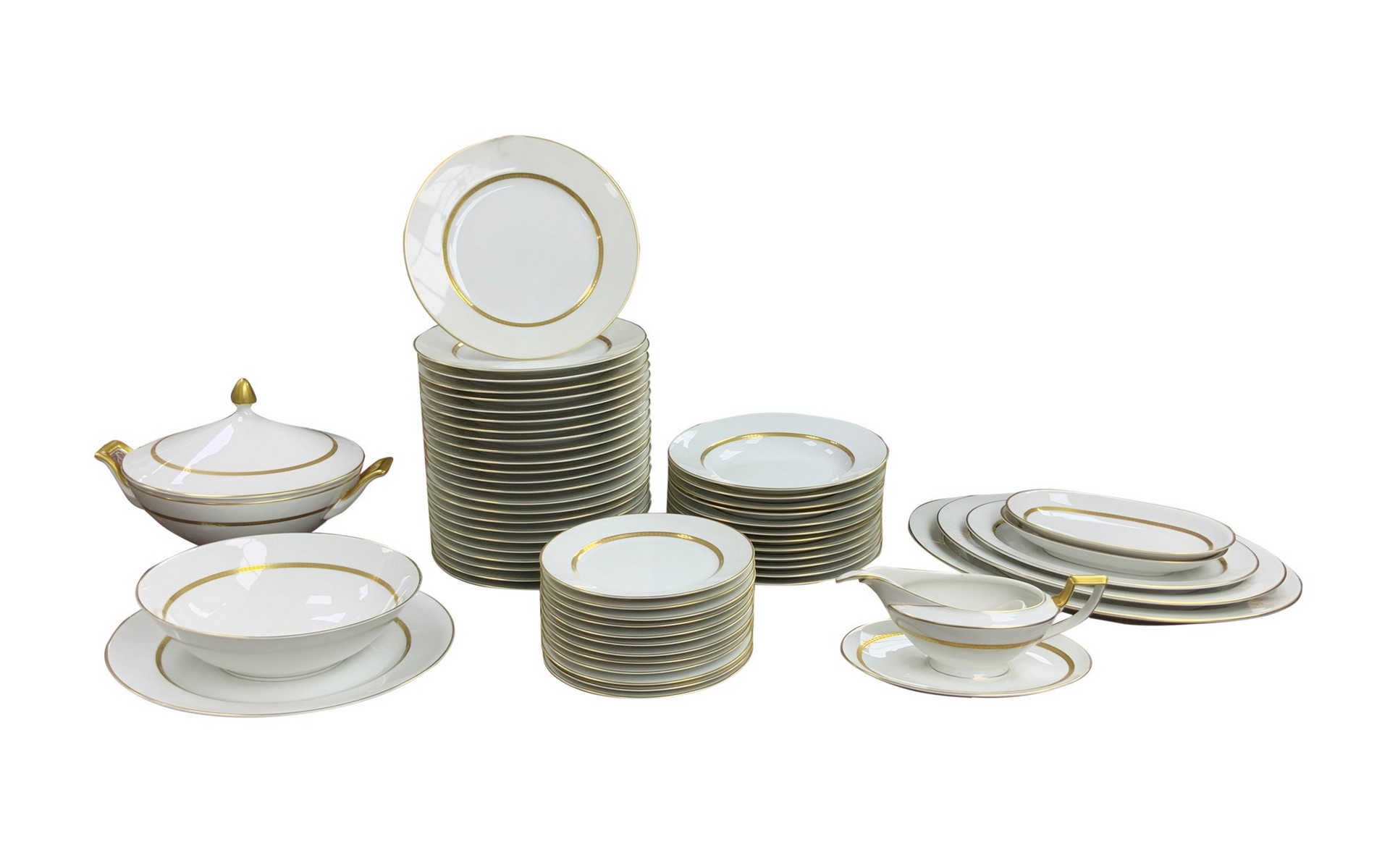 Servizio porcellana H & C ‘Selb Bavaria’ Heinrich Porcellana Bordi interni in oro, 24 piatti piani, 12 piatti fondi, 12 piatti dessert, 6 piatti da portata, 1 insalatiera, 1zuppiera, 1 salsiera