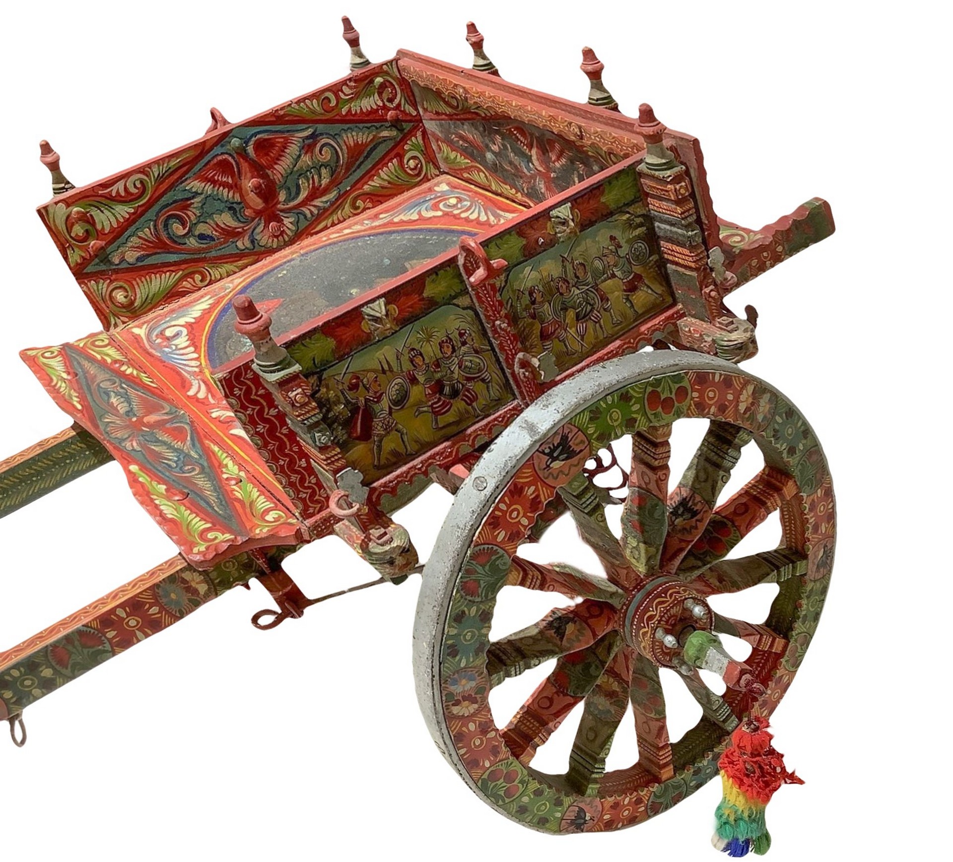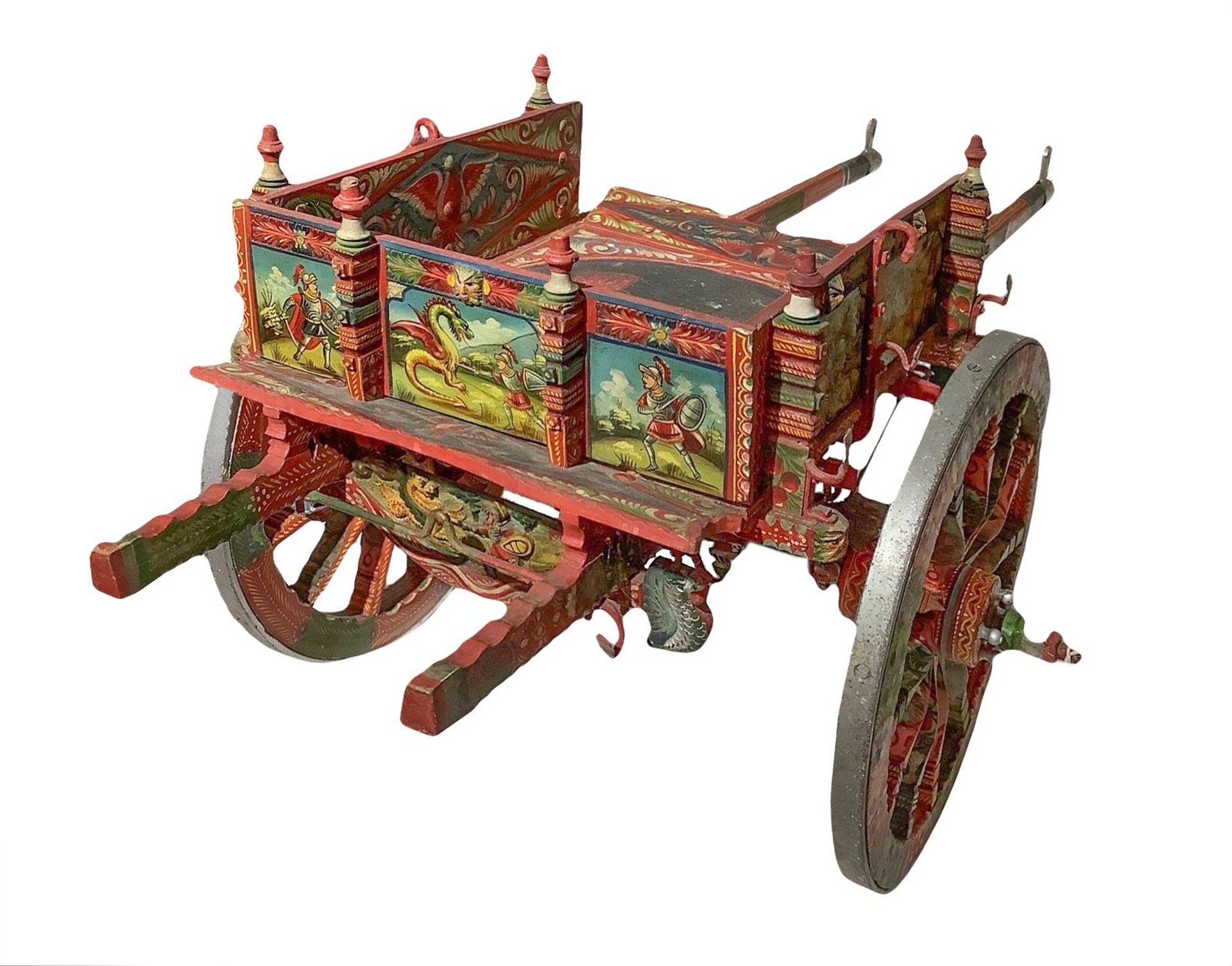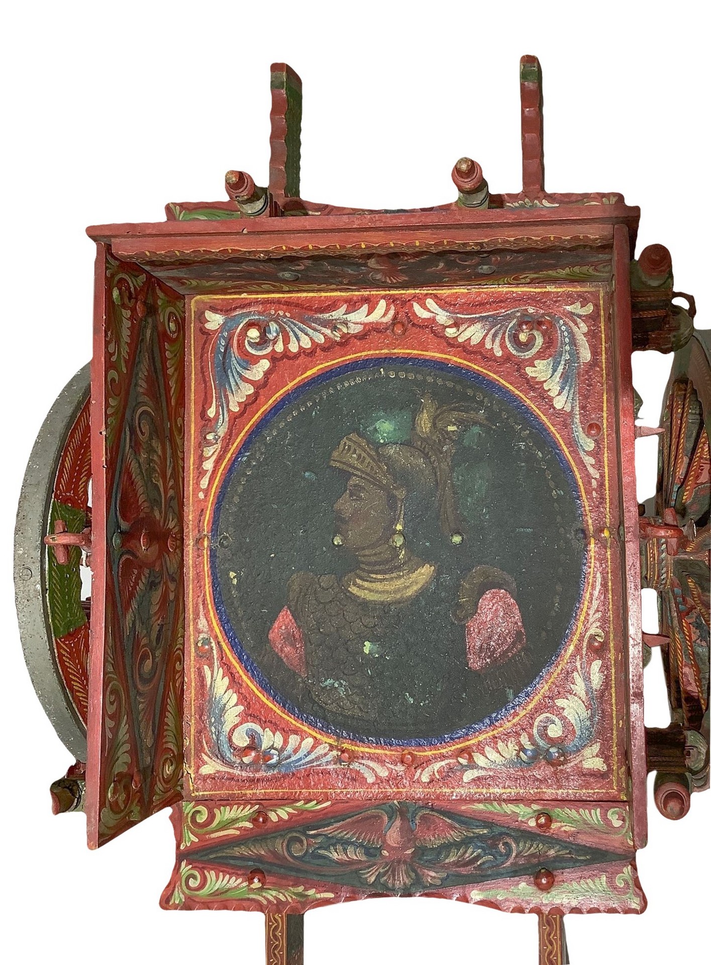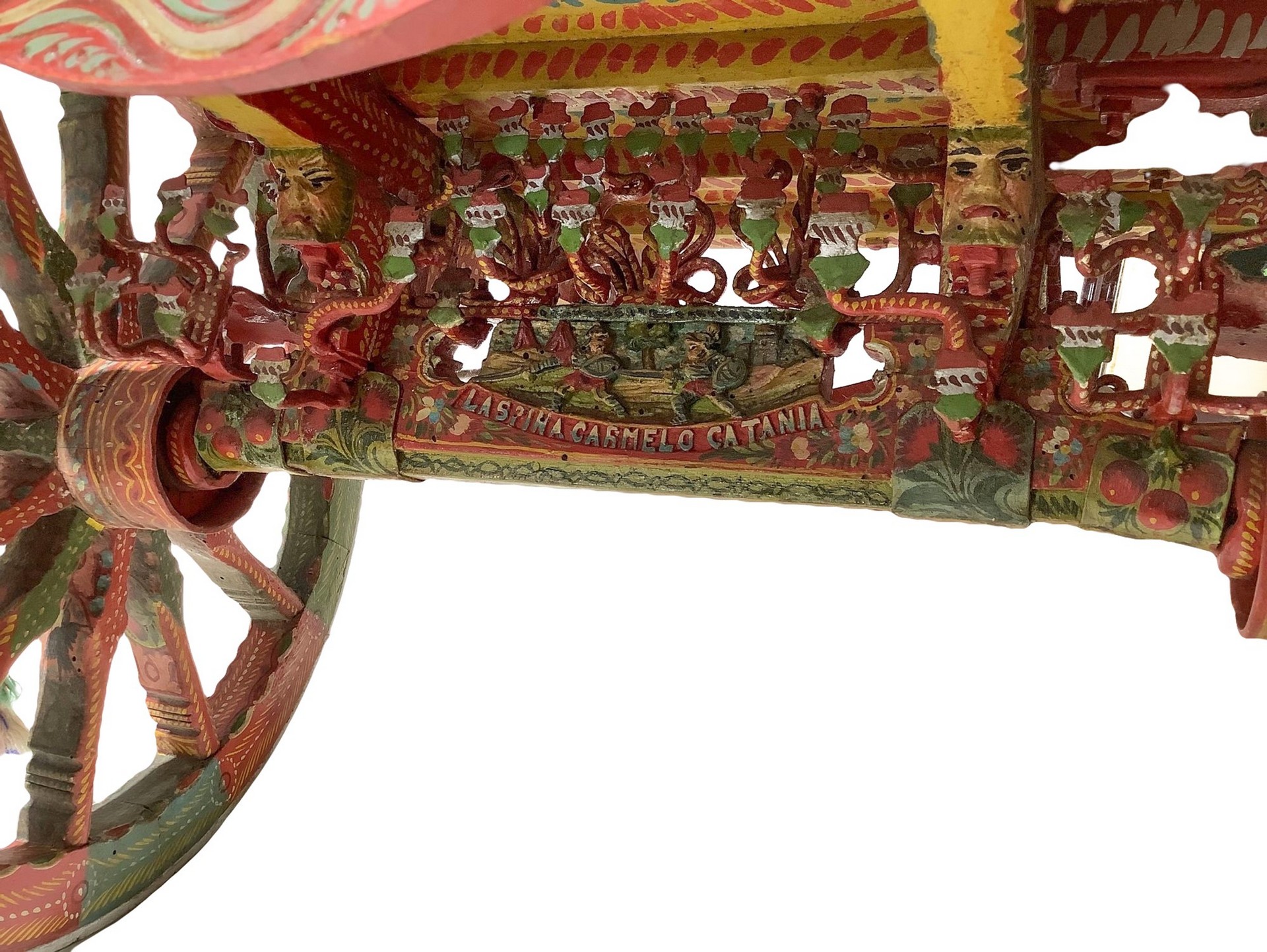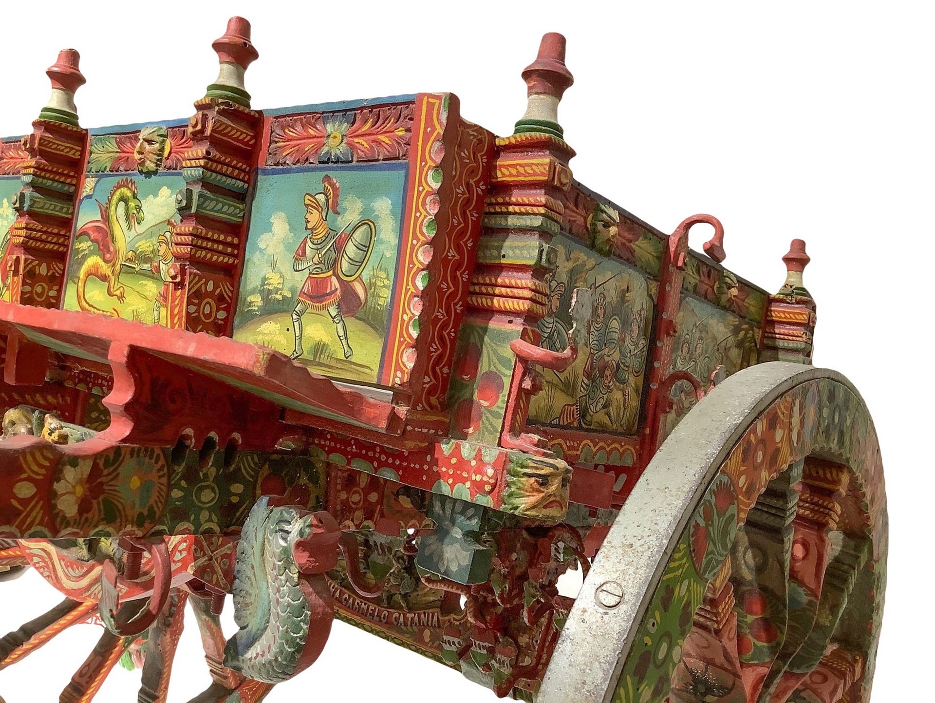 Piccolo carretto siciliano dipinto e laccato con pitture raffiguranti paladini di Francia de "La Chanson de Roland". diametro ruote 48 cm, altezza, 60 lunghezza 135 cm Maestro carratore La Spina Carmelo.