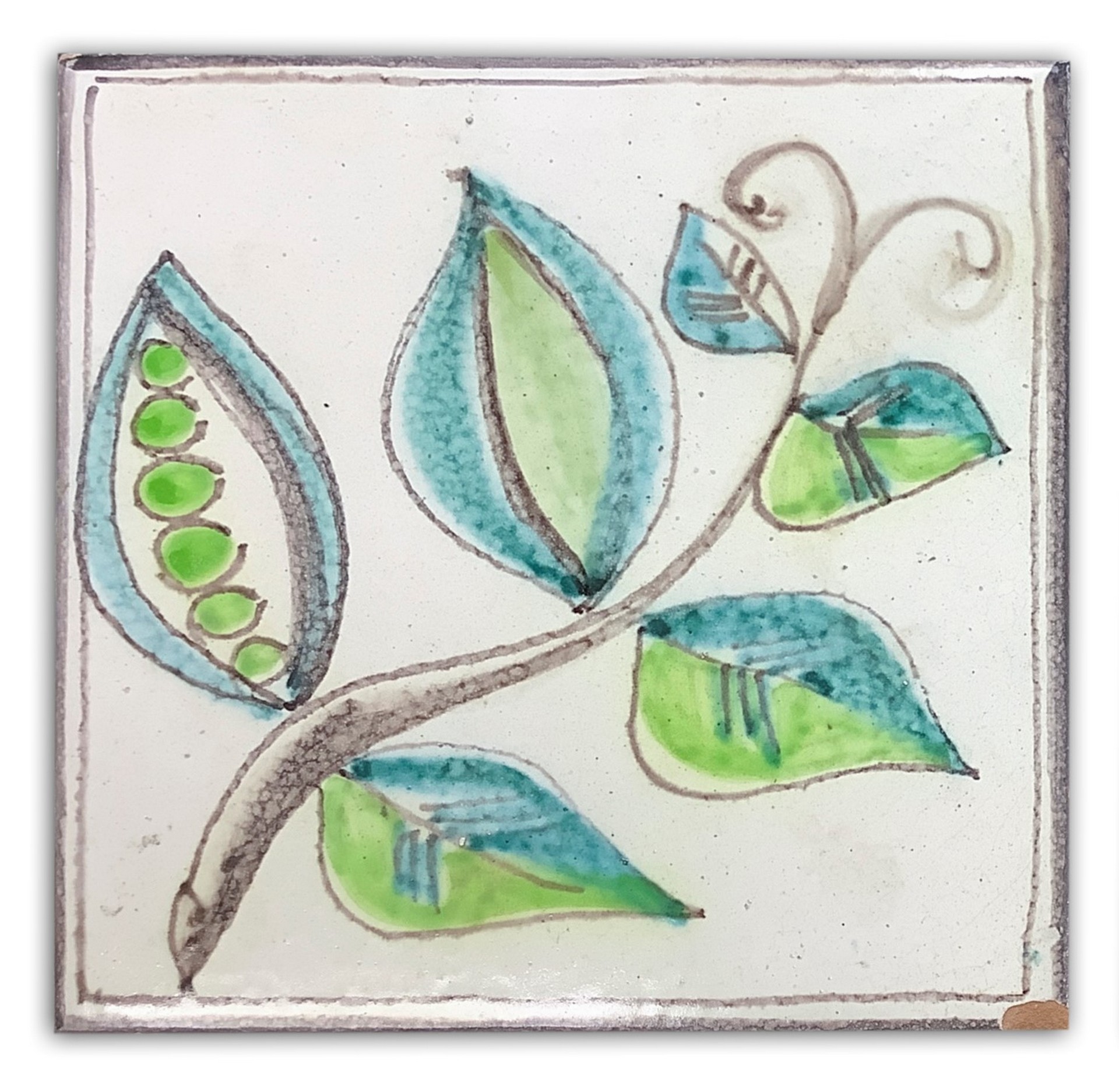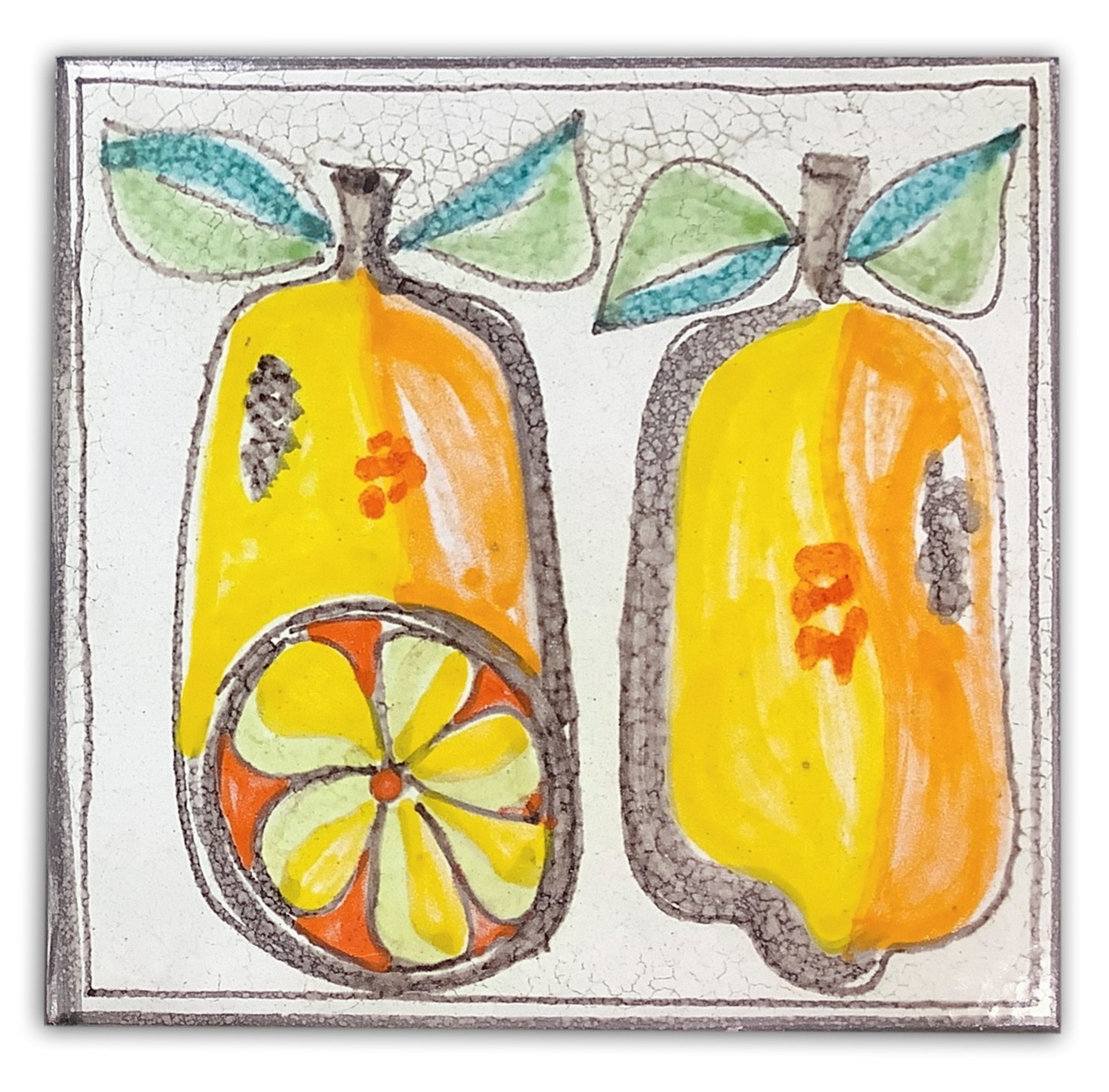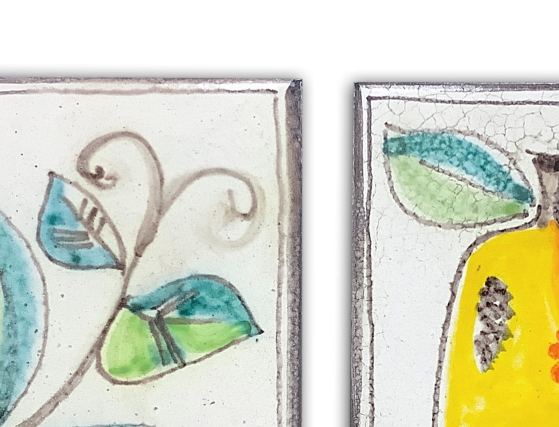 De Simone - Coppia di piastrelle in maiolica raffiguranti un agrume e una pianta di piselli 20x20 cm