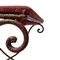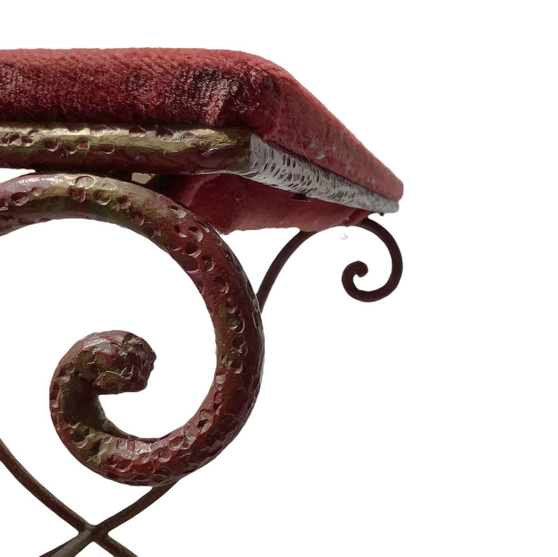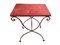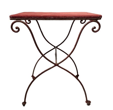 Tavolo gueridon con ruote, Early 20th century H 79 cm, 50x65 cm Ferro con struttura in tondino metallico curvato e superficie con lavorazione martellata. Piano in legno rivestito in panno nei toni del borgogna. Attribuibile alla manifattura Aurelio Mingazzi