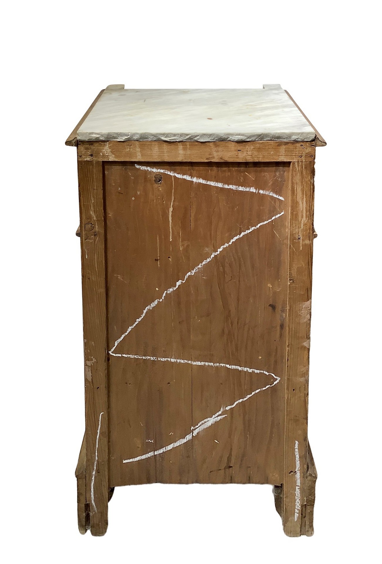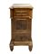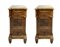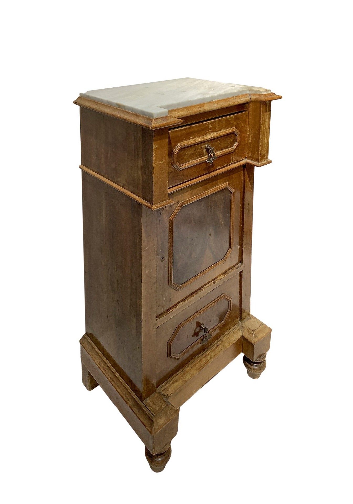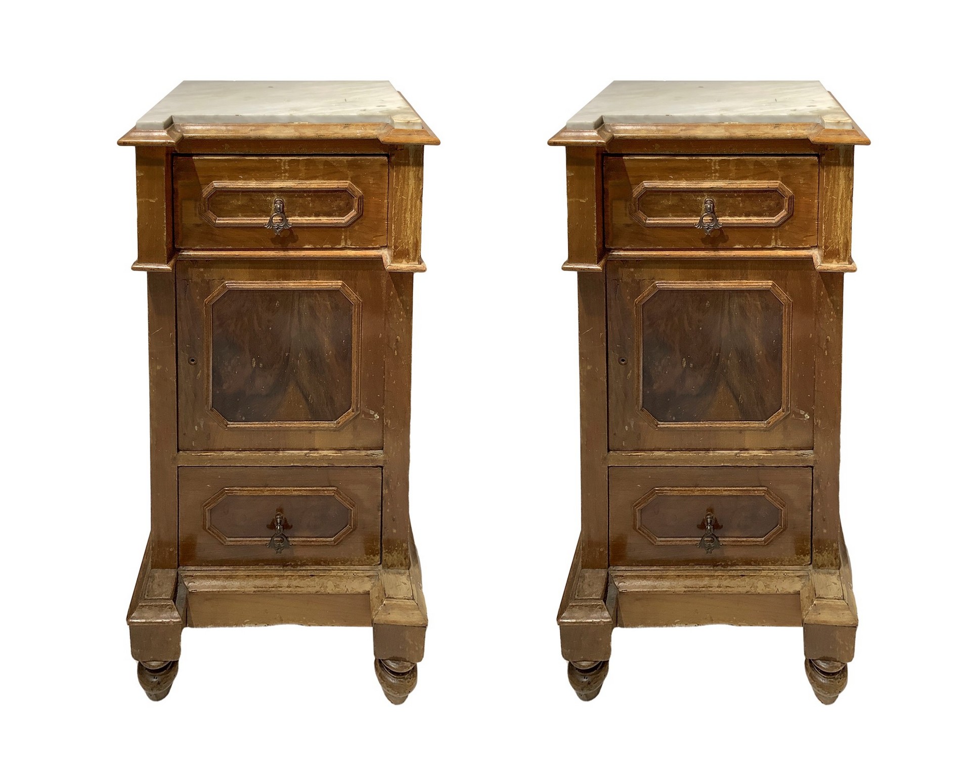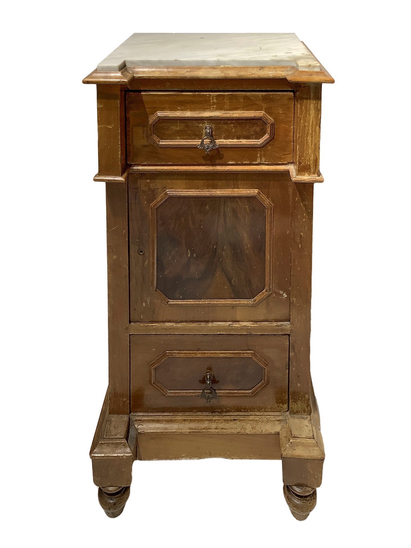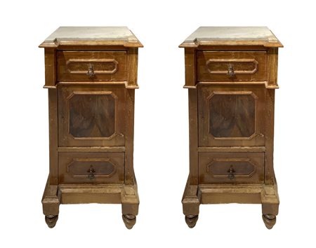 Coppia di comodini in legno di noce h 90, 42x32 cm Marmo al piano, cassetto superiore e inferiore, sportello al centro, piedi a cipolla.