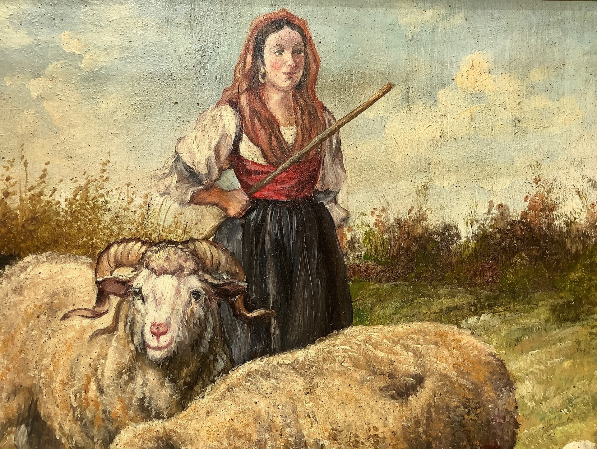 La quotidianità della vita dei campi, genere pittorico che affonda le radici nel tardo XVII secolo per poi affermarsi nel corso dell'Ottocento, è qui proposto con la rappresentazione di una giovane pastorella intenta a condurre le proprie pecore al pascolo. Il realismo intriso nella composizione scenica è parte di quella corrente stilistica che coinvolge anche il campo letterario, con i movimenti del verismo e del naturalismo, le cui tematiche dell'umilità e della povertà vengono poste sullo stesso piano dei grandi soggetti storici e religiosi. Nel nostro dipinto non esiste alcun intento di restituzione della luce, come poteva essere al tempo l'esigenza degli impressionisti, quanto l'esaltazione della campagna, della pastorizia e più ampiamente del genere popolare.