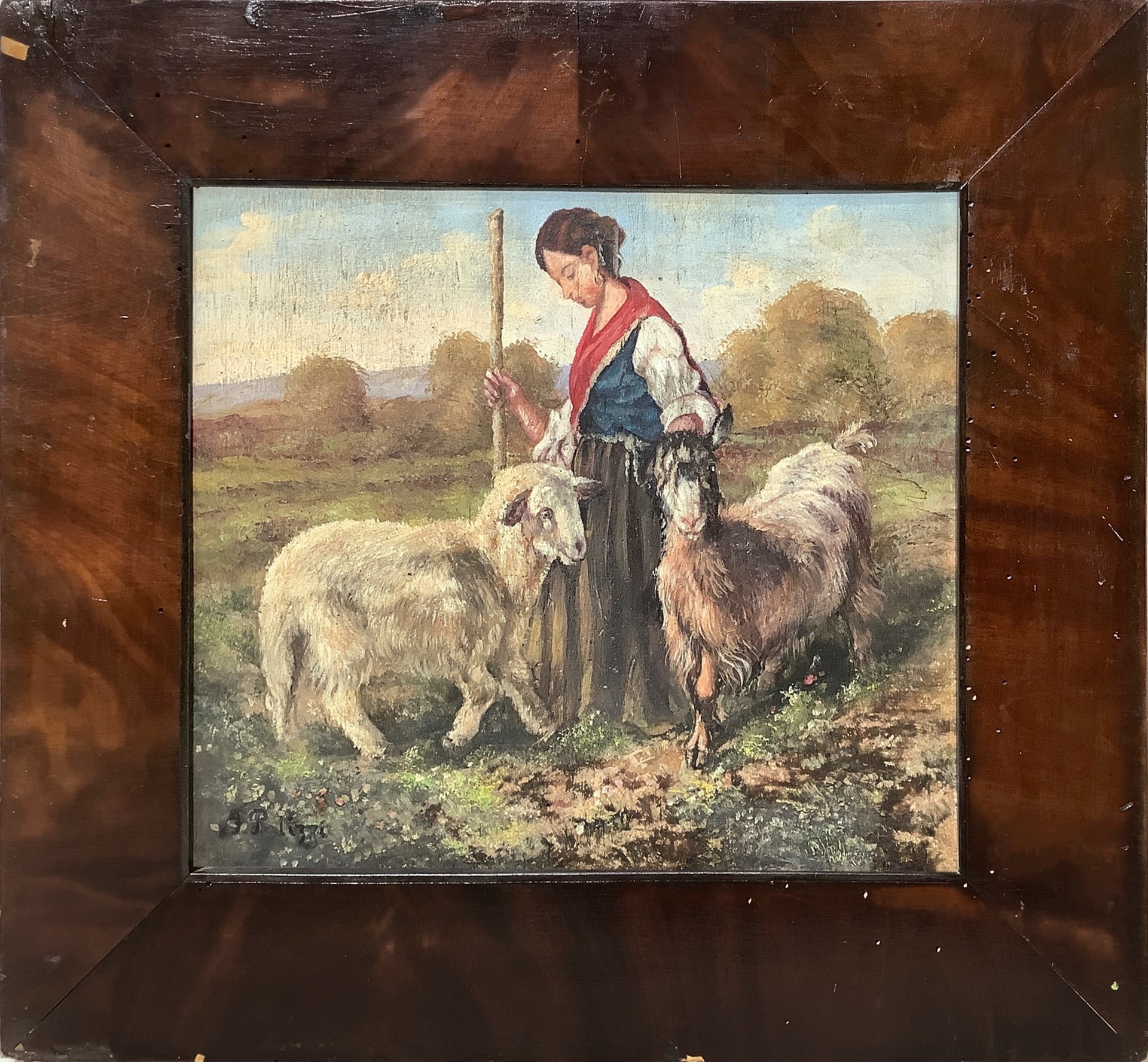 Francesco Paolo Palizzi (attribuito a) (Vasto 1825-Napoli 1871) - Pastorella con due caprette H 27 cm x Base 30 cm. In cornice H 39 cm x Base 42 cm Dipinto ad olio su tavoletta