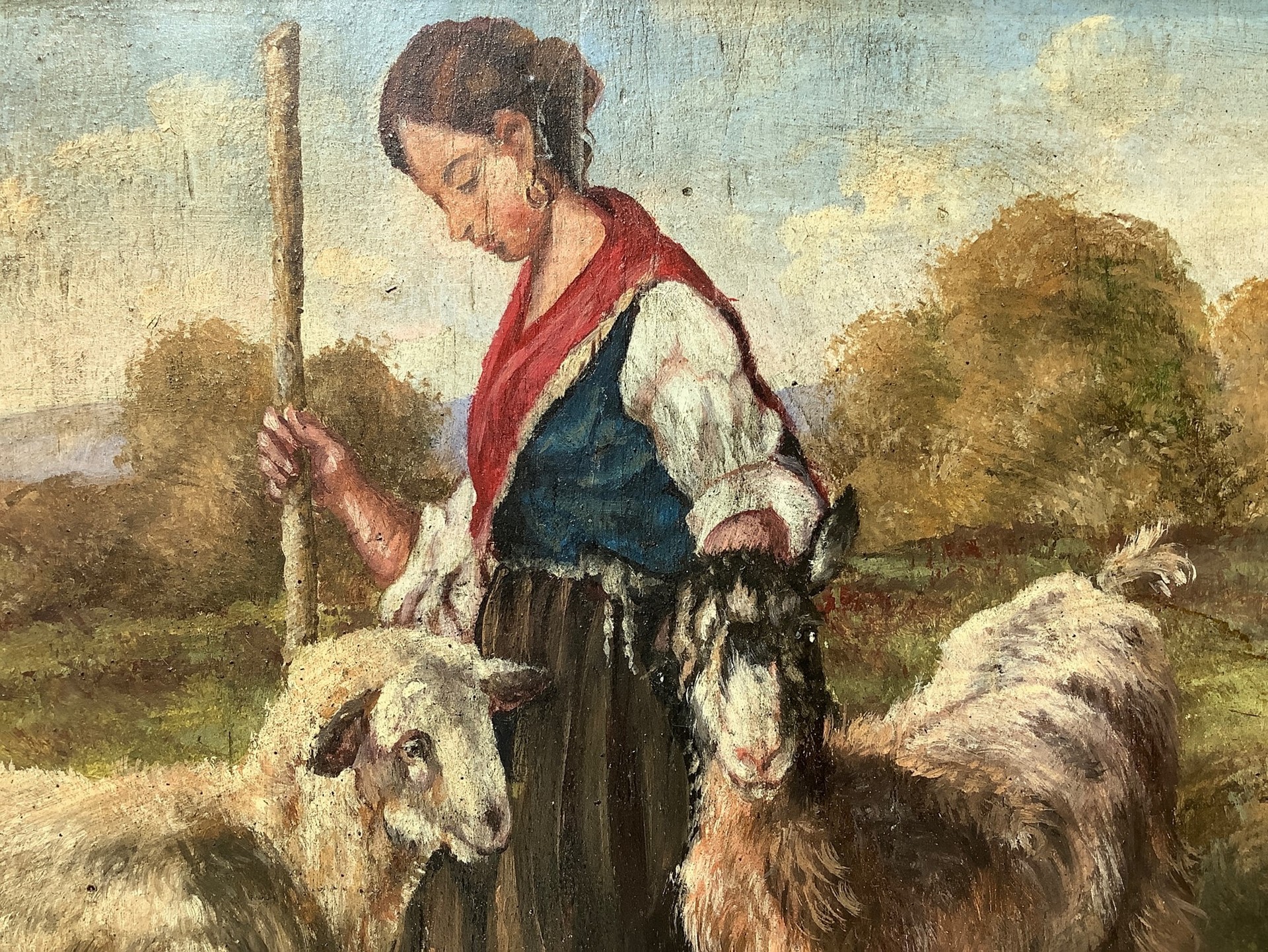 La quotidianità della vita dei campi, genere pittorico che affonda le radici nel tardo XVII secolo per poi affermarsi nel corso dell'Ottocento, è qui proposto con la rappresentazione di una giovane pastorella intenta a condurre le proprie pecore al pascolo. Il realismo intriso nella composizione scenica è parte di quella corrente stilistica che coinvolge anche il campo letterario, con i movimenti del verismo e del naturalismo, le cui tematiche dell'umilità e della povertà vengono poste sullo stesso piano dei grandi soggetti storici e religiosi. Nel nostro dipinto non esiste alcun intento di restituzione della luce, come poteva essere al tempo l'esigenza degli impressionisti, quanto l'esaltazione della campagna, della pastorizia e più ampiamente del genere popolare.