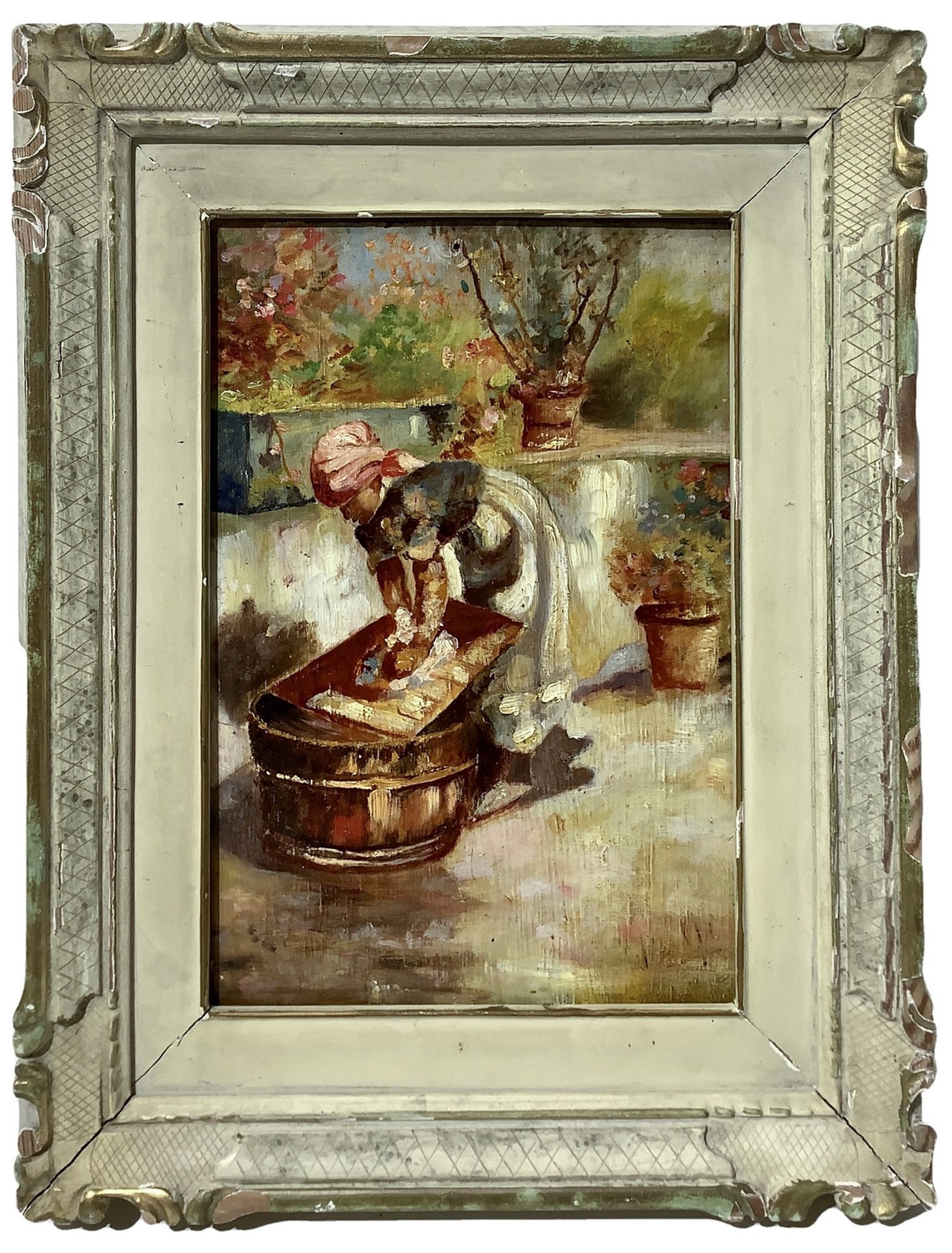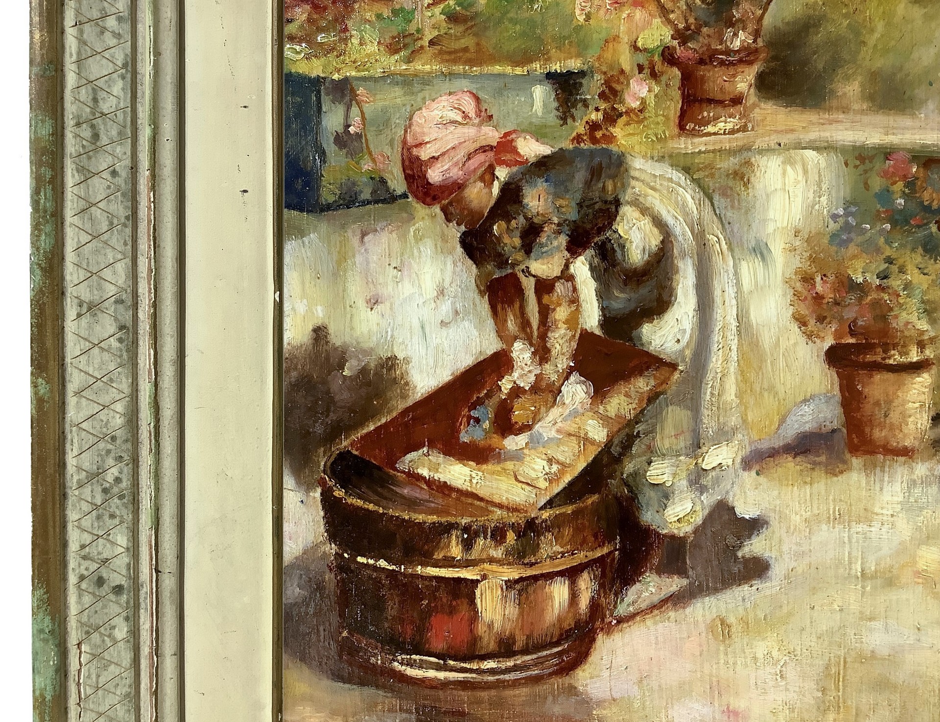 Irolli, Vincenzo (Napoli 1860-Napoli 1949) - Lavandaia H 30 cm x Base 21,5 cm. In cornice: H 43,5 cm x Base 33 cm Dipinto ad olio su tavoletta Firmato in basso a destra