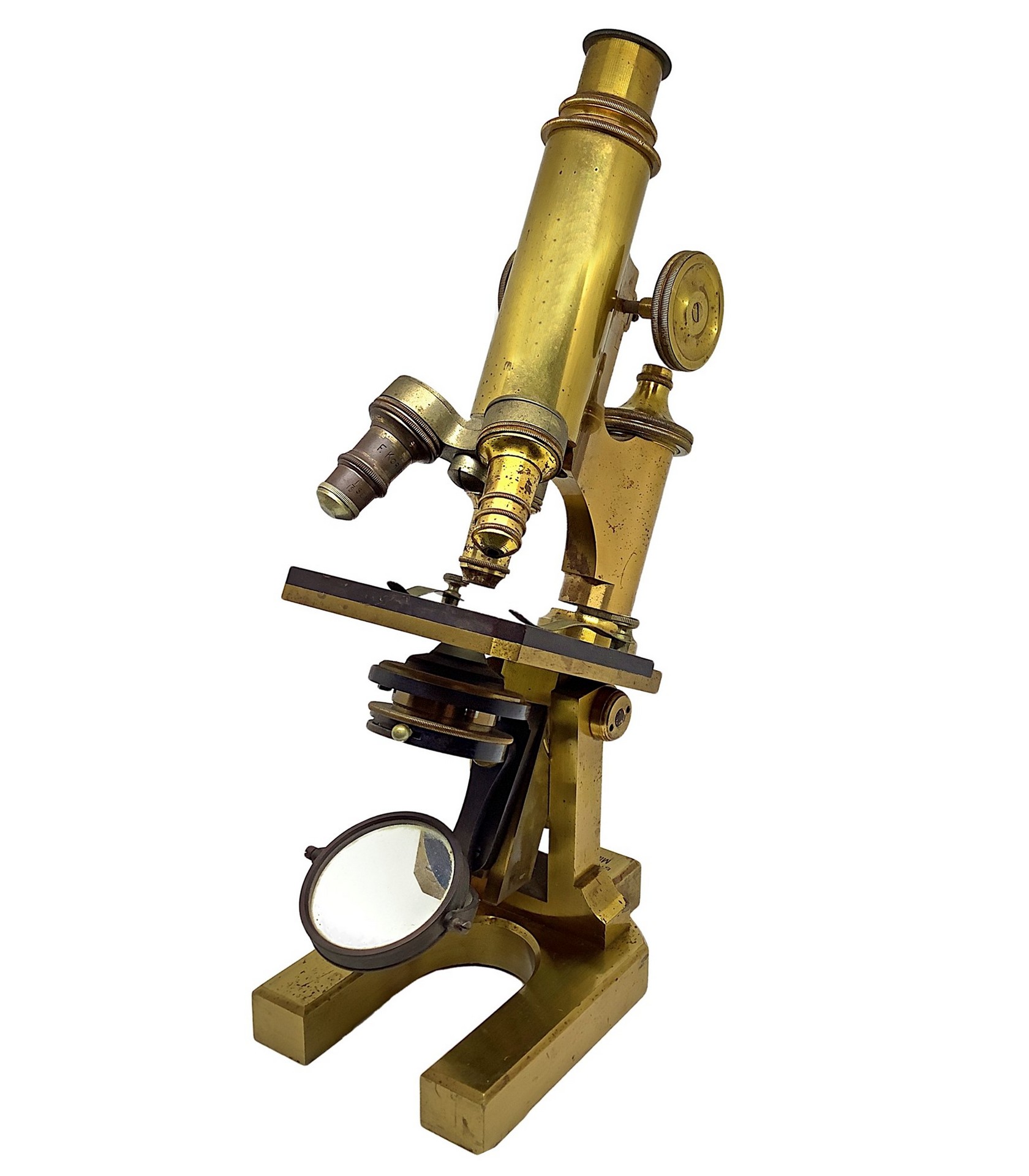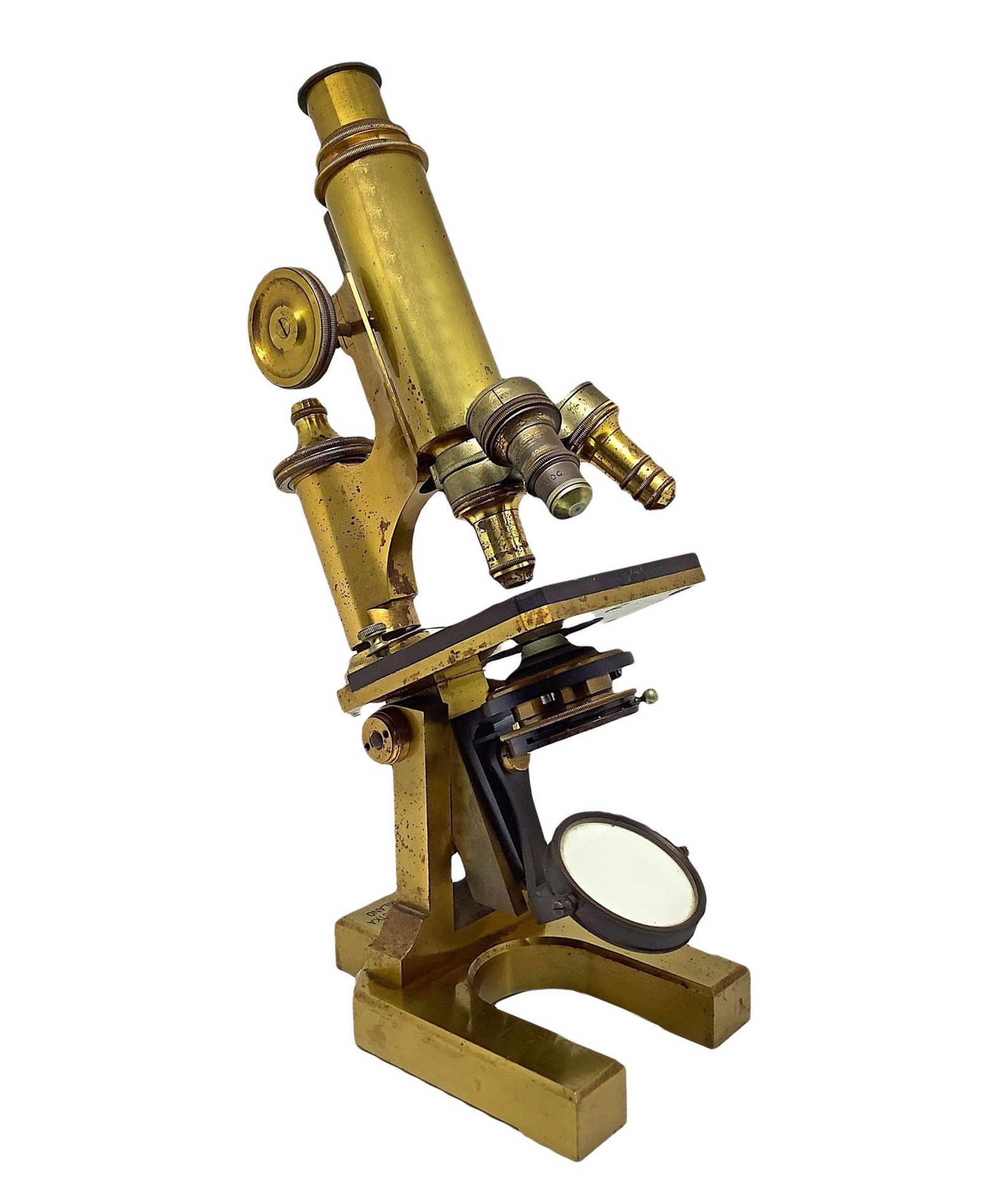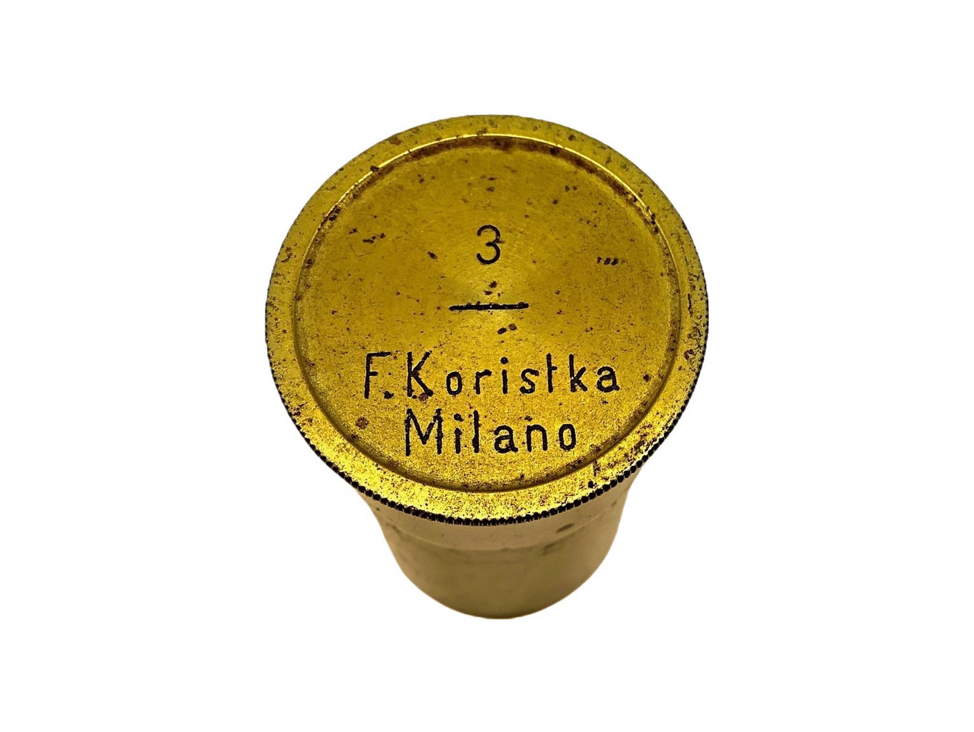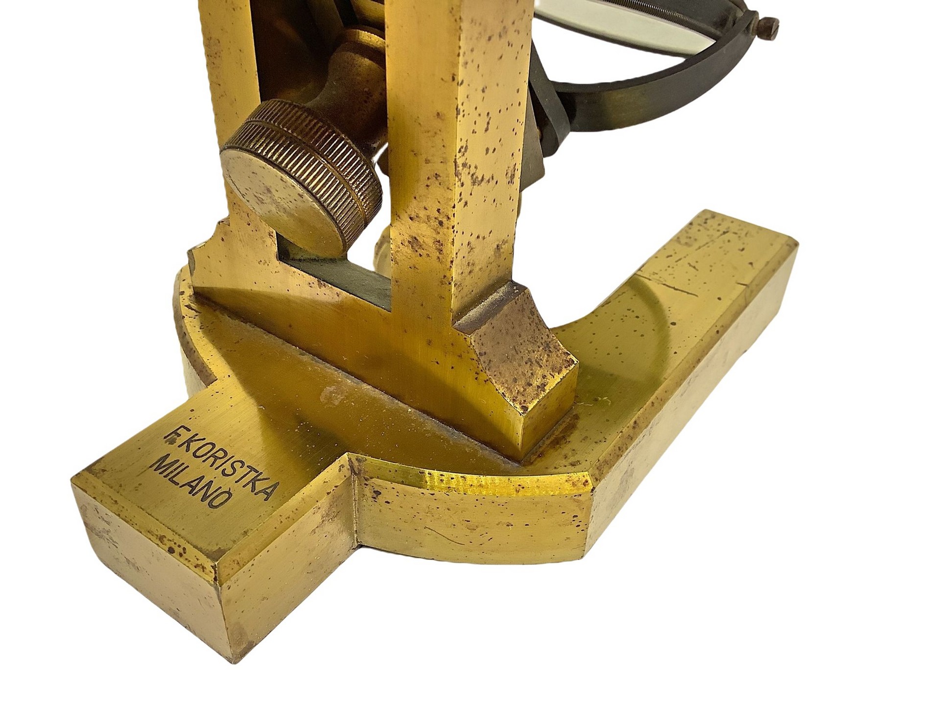 F.lli Koristka - Microscopio in metallo dorato, con vari accessori H cm 31 F.lli Koristka di Milano, industria ottica molto conosciuta ed a cui si devono molte innovazioni nel campo dei microscopi. Per anni collaborarono con Abbe e con la Zeiss alla produzione di nuovi vetri dalle caratteristiche particolari e furono loro a costruire i primi obiettivi corretti su tre diverse lunghezze d'onda.