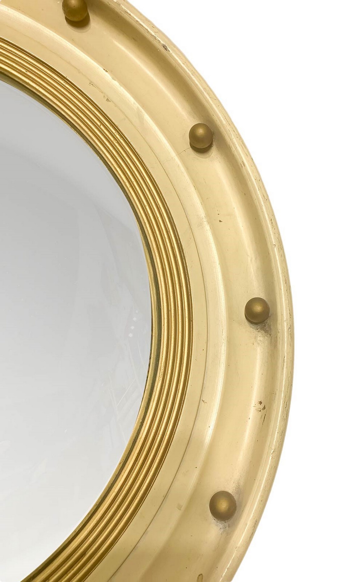 Specchiera in legno di forma circolare laccata nei toni dell'avorio. Dettagli dorati e specchio convesso, nello stile dell'Atelier Borsani (Varedo), anni '40. Diametro cm 50. Specchiera in legno di forma circolare laccata nei toni dell'avorio. Dettagli dorati e specchio convesso, nello stile dell'Atelier Borsani (Varedo), anni '40. Diametro cm 50.