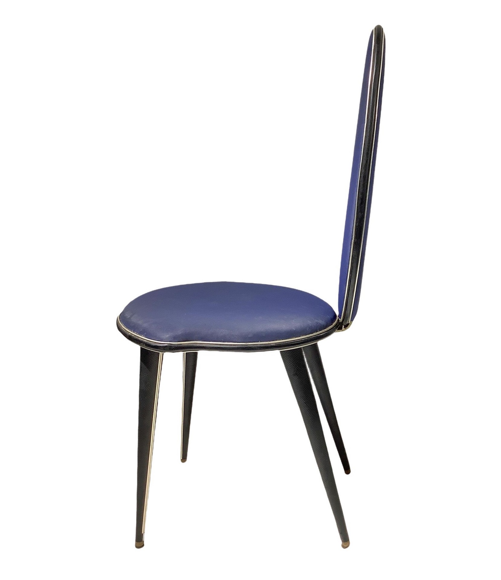 Mascagni, Umberto (1930) - Gruppo n. 4 sedie h 96 cm, seduta 45 cm Piedi tronco conici, struttura in legno, rivestimento in finta pelle, bordi in alluminio addentato. Piccoli difetti d'uso.