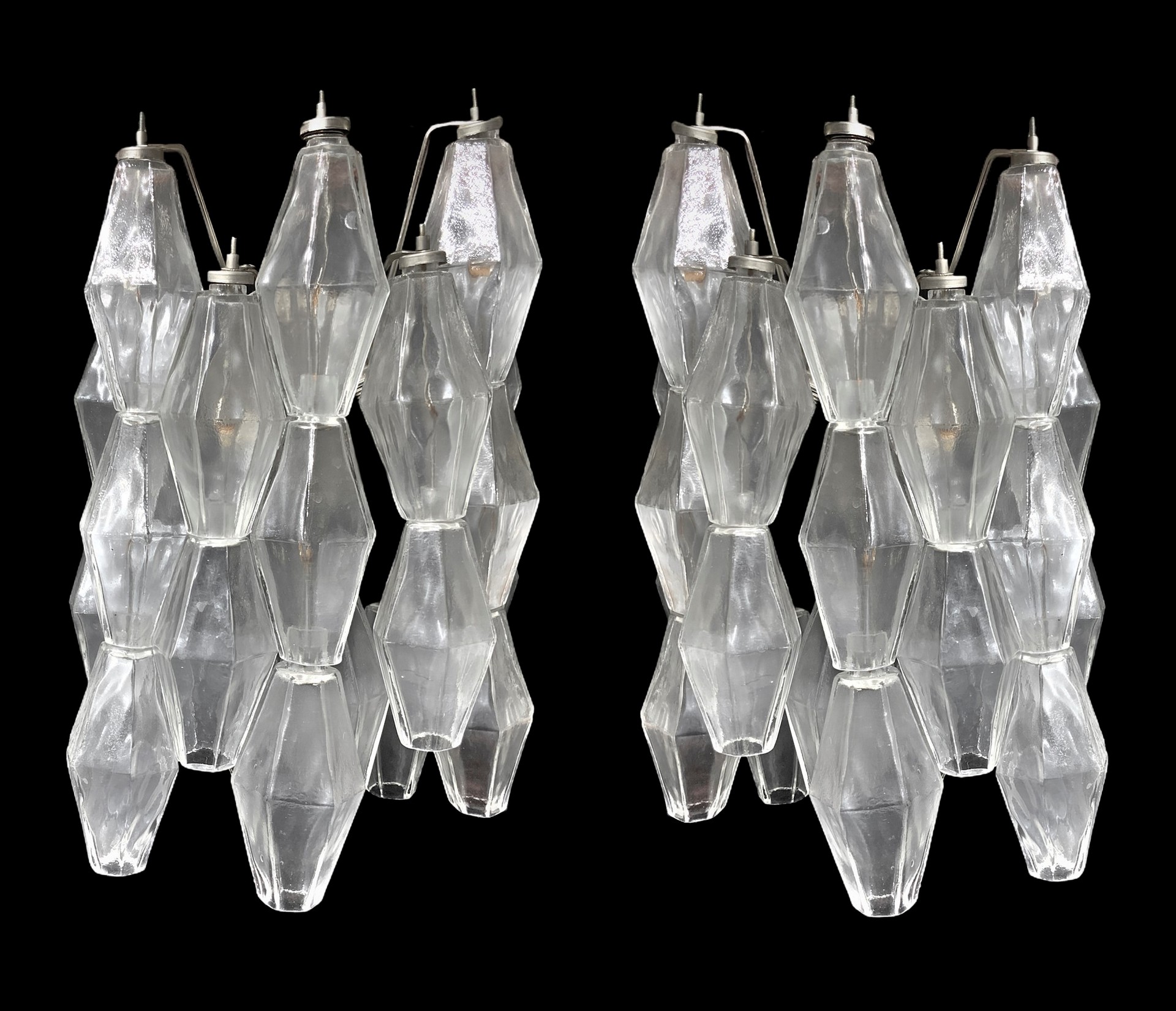 Produzione italiana nello stile Venini Coppia di applique con struttura in metallo laccato e poliedri H cm 40 x28 Bianche con struttura cromata ed elementi in vetro trasparente.