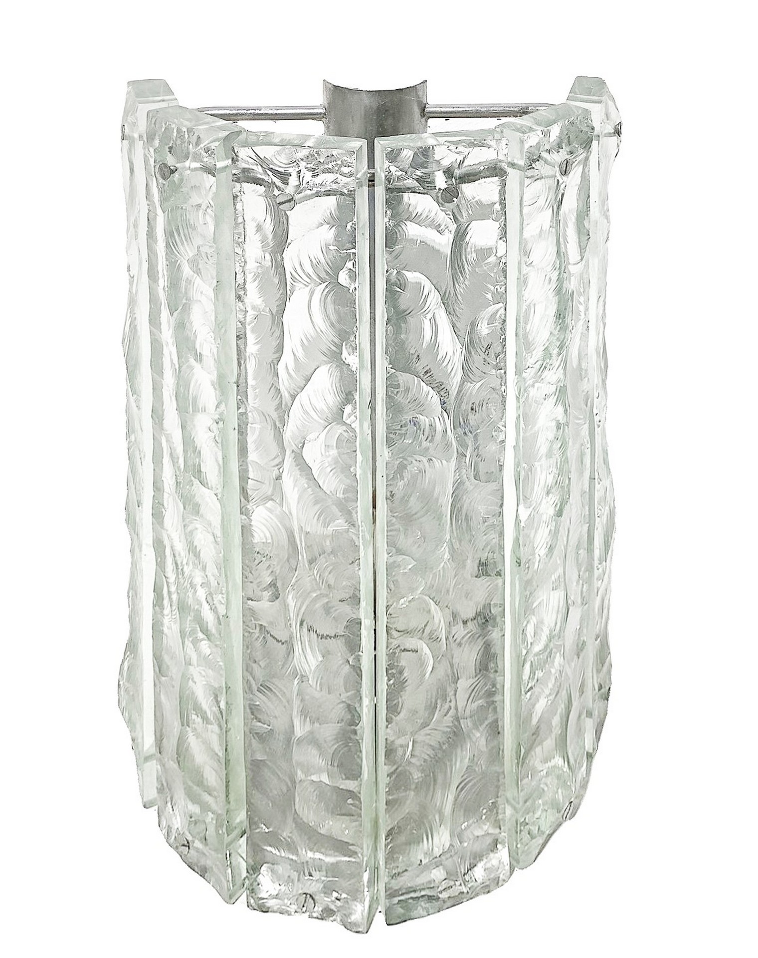per FontanaArte, Max Ingrand - Coppia di appliques H cm 27x19 Designer Max Ingrand. Mod. 2448, struttura in ottone nichelato lucido e diffusori in vetro scalpellato nei toni del verde chiaro. Da rielettrificare. Segni d'uso