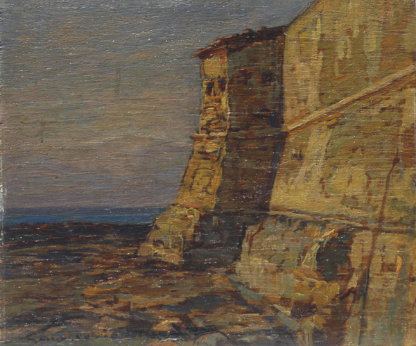 Gino Romiti (Livorno, 1881 - 1967) IL LAZZERETTO, 1925 Olio su tavoletta, cm. 9,5x11,4 Firma e data in basso a sinistra e sul verso.