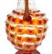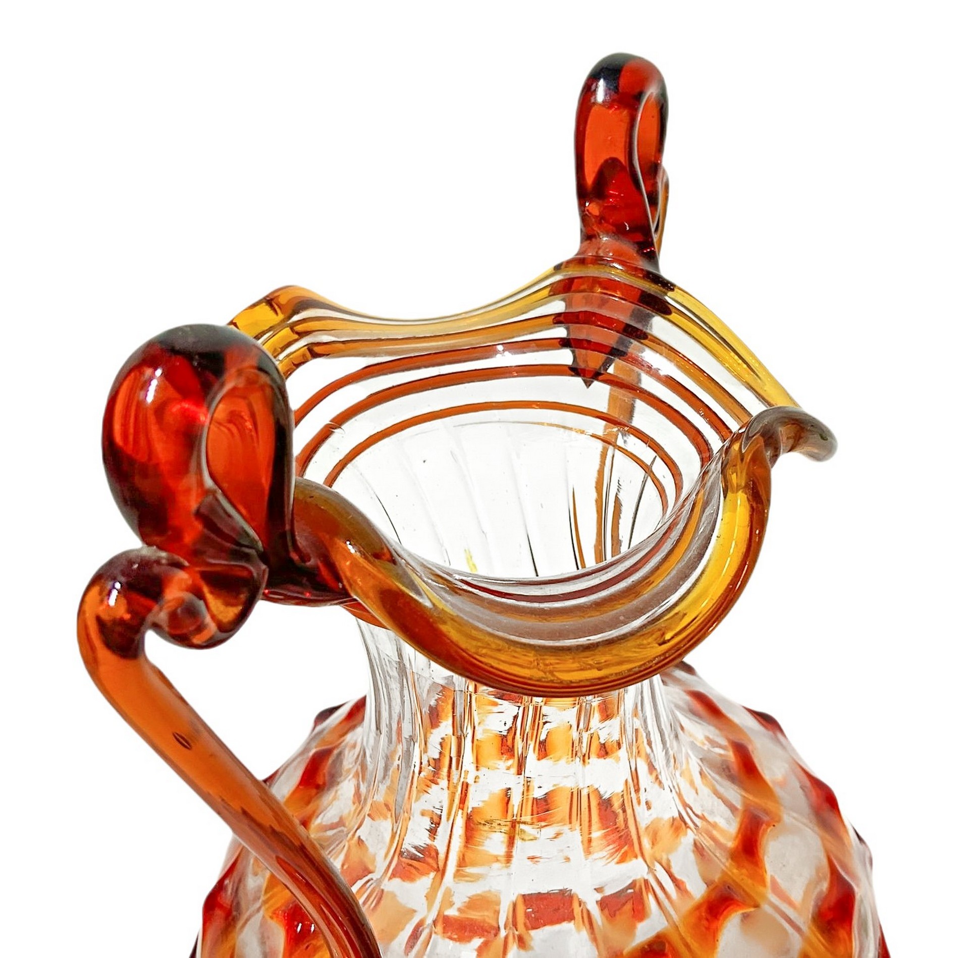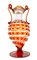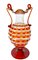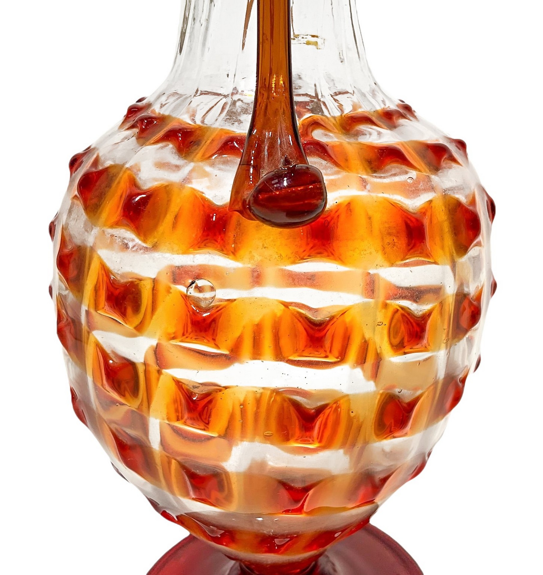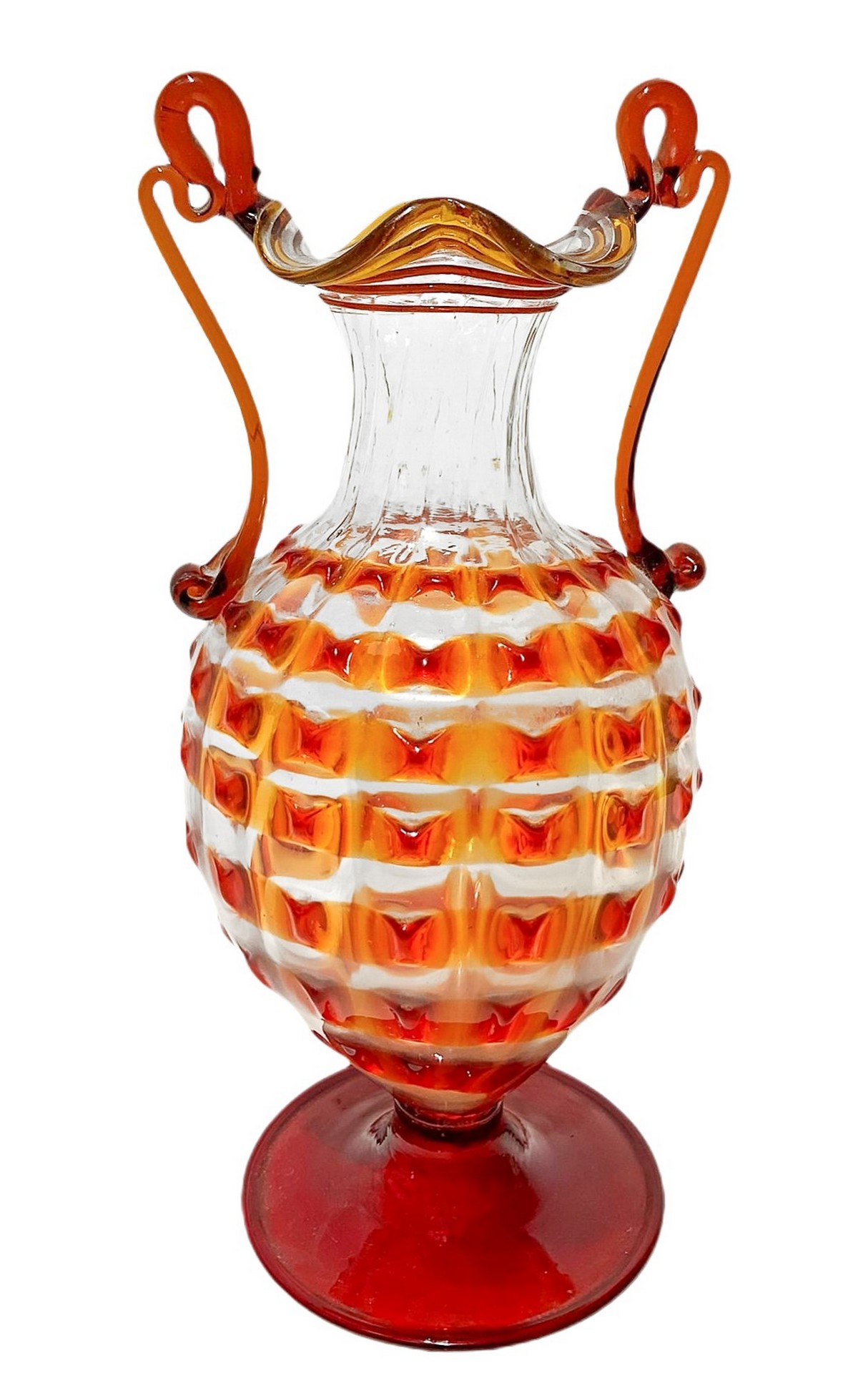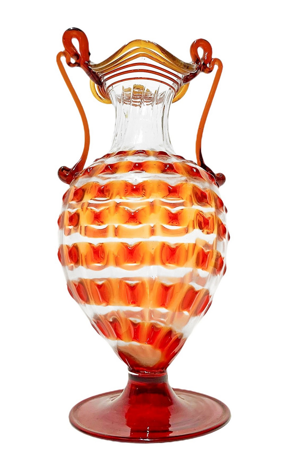 Toso, Fratelli - Vaso biansato a corpo costolato H cm 34 Orlo ondulato e anse a riccioli. Vetro soffiato incolore con applicazioni bugnate. Base in vetro rosso trasparente. Leggera filatura alla bocca. Italia, Murano.